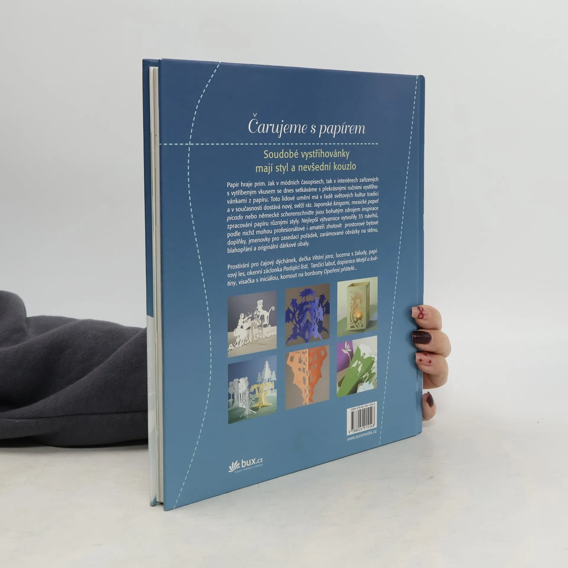 Soudobé vystřihovánky mají styl a nevšední kouzlo. Jak v módních časopisech, tak v moderních interiérech se setkáváme s překrásnými ručními vystřihovánkami z papíru. Japonské kirigami, mexické papel picado nebo německé scherenschnitte jsou bohatým zdrojem inspirace.zpracování papíru různými styly. 35 návrhů na prostorové bytové doplňky, jmenovky, zarámované obrázky na stěnu, blahopřání a originální dárkové obaly, prostírání, dečky, okenní záclonky, dopisnice, visačky s iniciálou, kornout na bonbony...