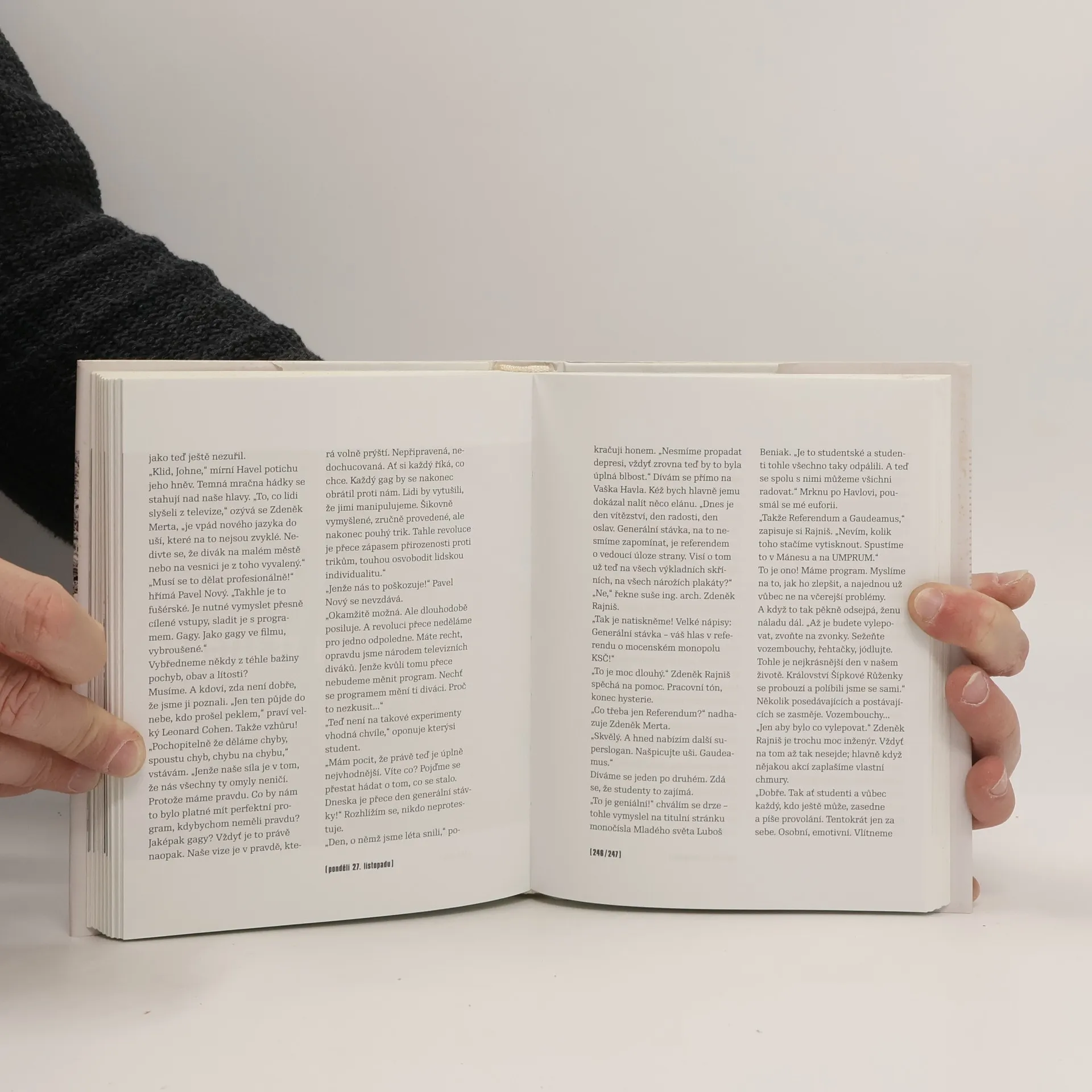 Během napínavé partie listopadové revoluce si jeden z významných hráčů vedl deník. Při jednáních, vedených za zavřenými dveřmi, zaznamenával i to, co studie historiků nezachytí: nejen slova, ale i pomlky. Nejen činy, ale i váhání a rozpaky. Naději i obavy. Gesta. Odvážné skutky lidí, kteří by jinak zůstali pro dějiny bezejmenní. Překotnost událostí na ulicích, v revolučním štábu, mezi stávkujícími studenty. Atmosféru okamžiků rozhodnutí v bytě Václava Havla i premiéra komunistické vlády Ladislava Adamce… Tak se zrodilo svědectví, jaké jiné revoluce nemají. Unikátní zpráva textaře, novináře a revolučního parlamentáře Michala Horáčka.