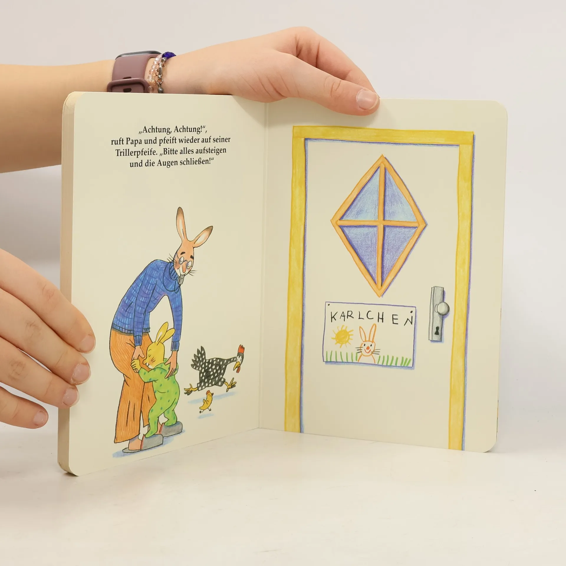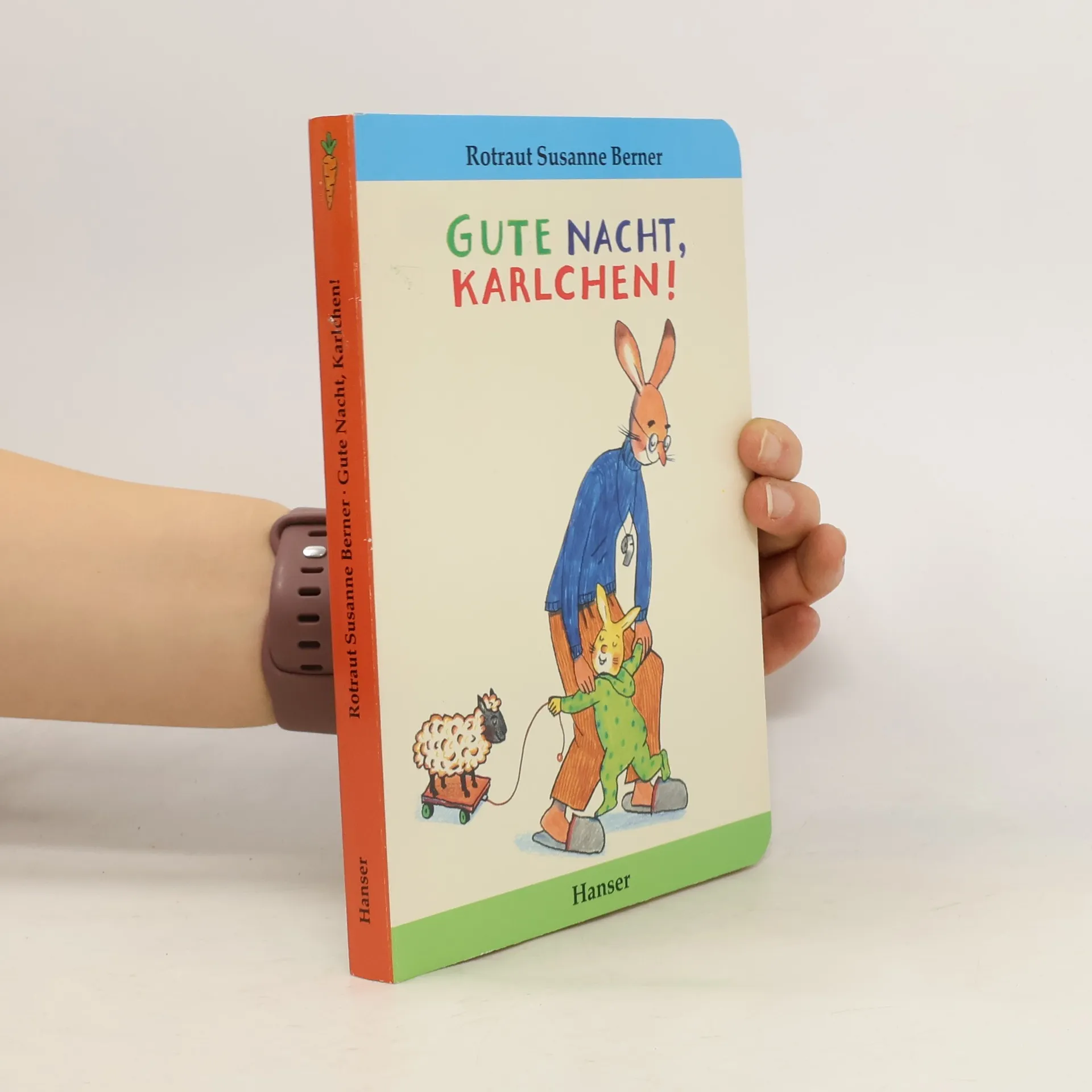 Auch Karnickel-Kinder wollen abends nicht gern schlafen gehen: In „Gute Nacht, Karlchen!“ spielt Papa mit Karlchen Pantoffelexpress. Erst geht's nach Esslingen in die Küche, danach ins Bad nach Feuchtlingen und dann zur Endstation Bettlingen. Nach so einer abendlichen Reise kann man wunderschön träumen.