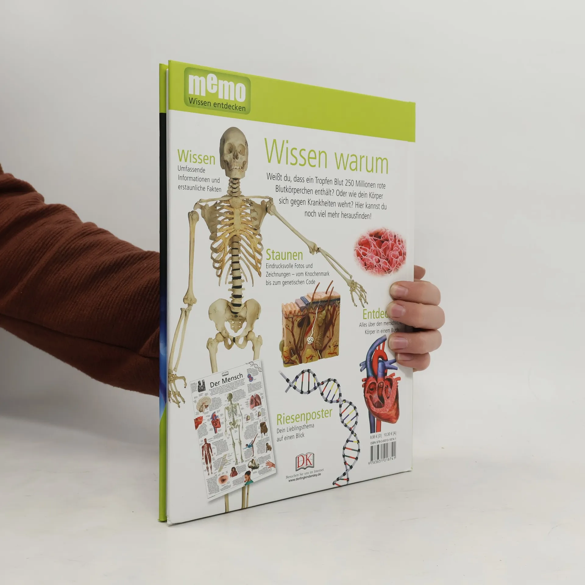 Wie funktioniert der menschliche Körper? Wie viele rote Blutkörperchen enthält ein Tropfen Blut? Und wie wehrt sich der menschliche Körper gegen Krankheiten? Auf diese und viele weitere Fragen bekommen Kinder in Band 2 der neuen grossen Wissensreihe memo Antworten. Eindrucksvolle Fotos und Zeichnungen - vom Knochenmark bis zum genetischen Code - kombiniert mit gut gegliederten, kurzen Texten erklären das komplexe Thema Mensch für Kinder leicht verständlich. Rubriken wie "Erstaunliche Fakten", "Fragen und Antworten" und "Rekordverdäch- tig" vertiefen das vermittelte Wissen, ein Glossar am Ende des Buches gibt noch einmal einen Überblick über die Thematik. Ideal auch für Referate und Schulprojekte.