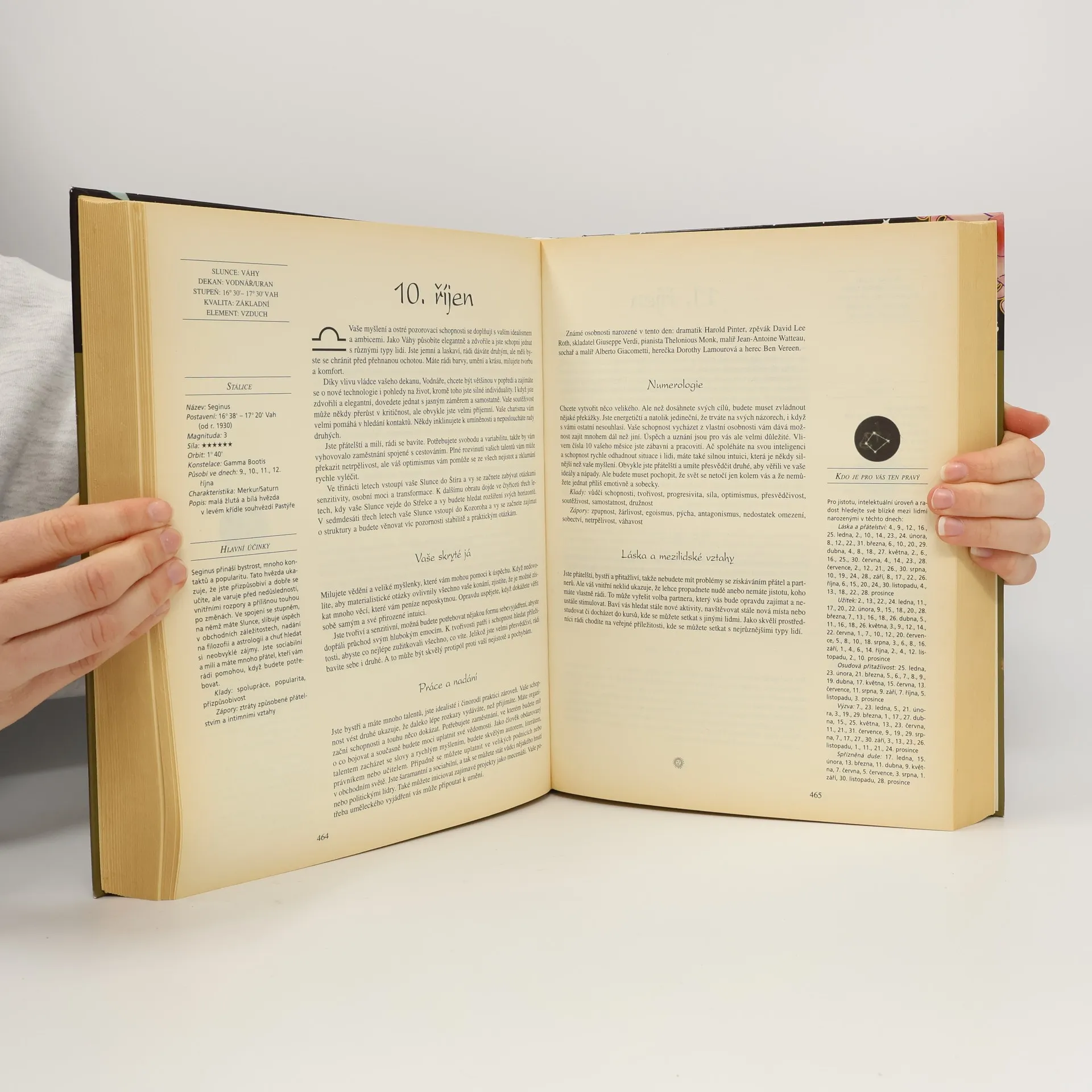 Nevšední publikace - výjimečná rozsahem i provedením - vede k hlubšímu porozumění jedinečného postavení člověka v kosmu. Charakteristiky podle data narození - 366 profilů, pro každý den roku jeden, obsahuje kladné a záporné rysy osobnosti, možnosti kariéry, doporučení v milostných i partnerských vztazích a nejlepší dny pro zamilování a navázání přátelství. Numerologické profily - odhalují význam devíti základníczh čísel a učí, jak si vypočítat své holistické číslo.