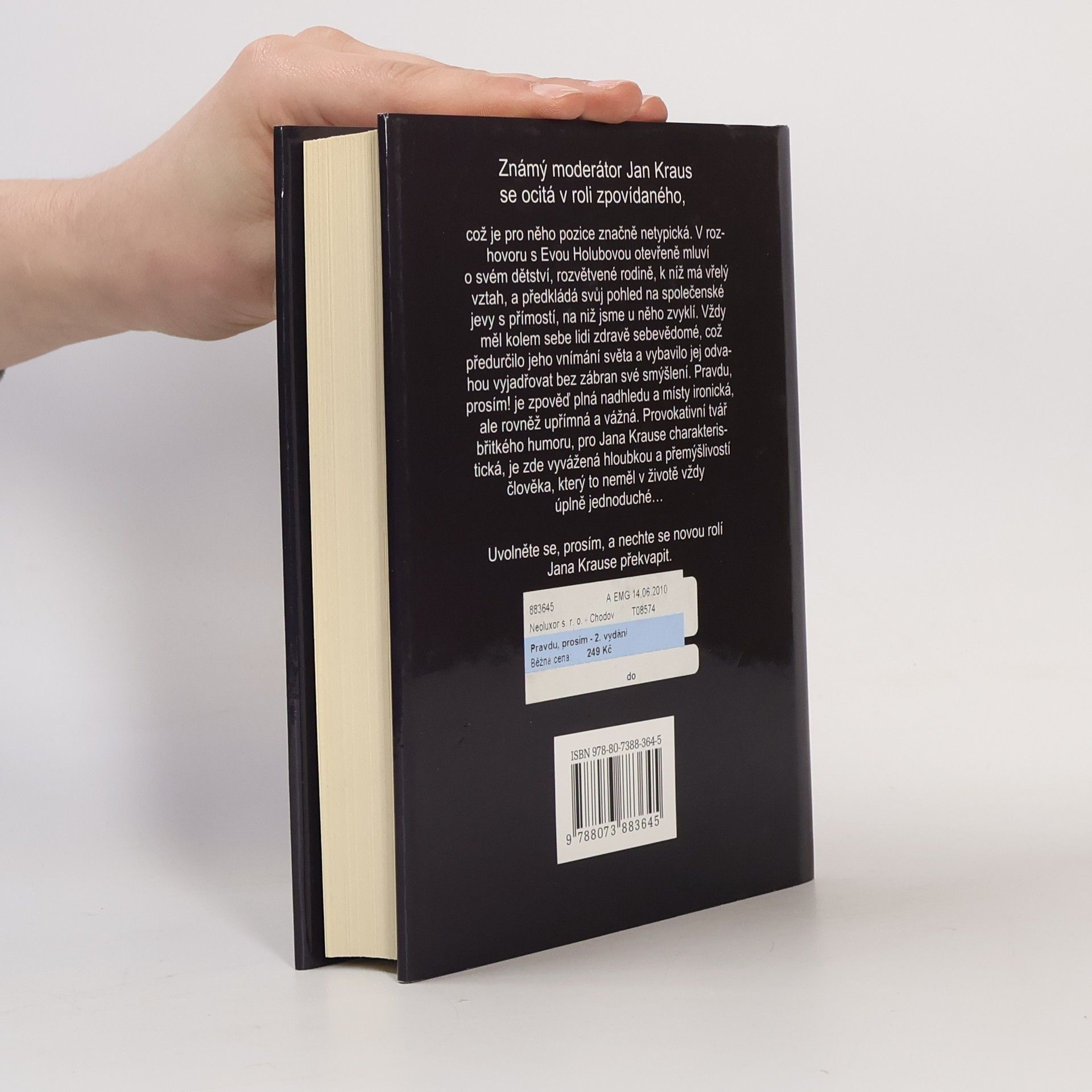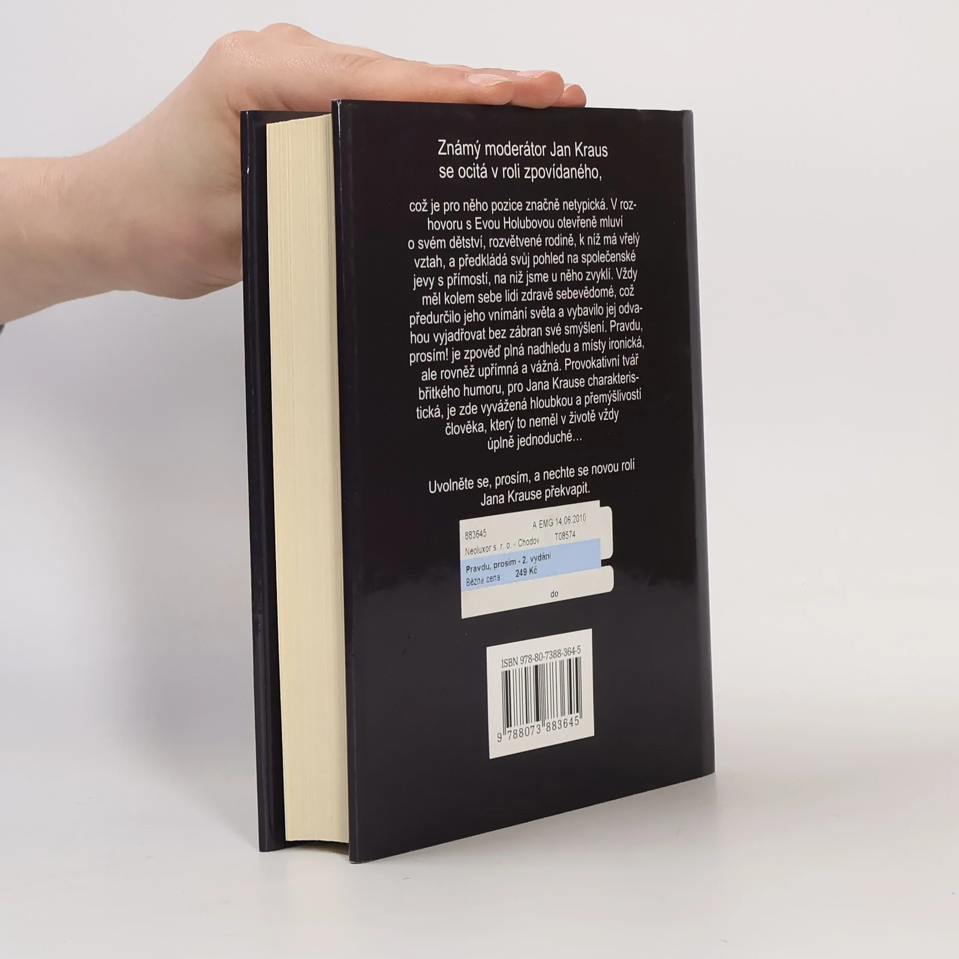 Známý moderátor Jan Kraus tentokrát v roli zpovídaného. V rozhovoru s Evou Holubovou otevřeně mluví o svém dětství, rozvětvené rodině a názorech na společnost. Zpověď plná nadhledu, místy ironická, ale rovněž upřímná a vážná. Provokativní tvář břitkého humoru je vyvážená hloubkou a přemýšlivostí.