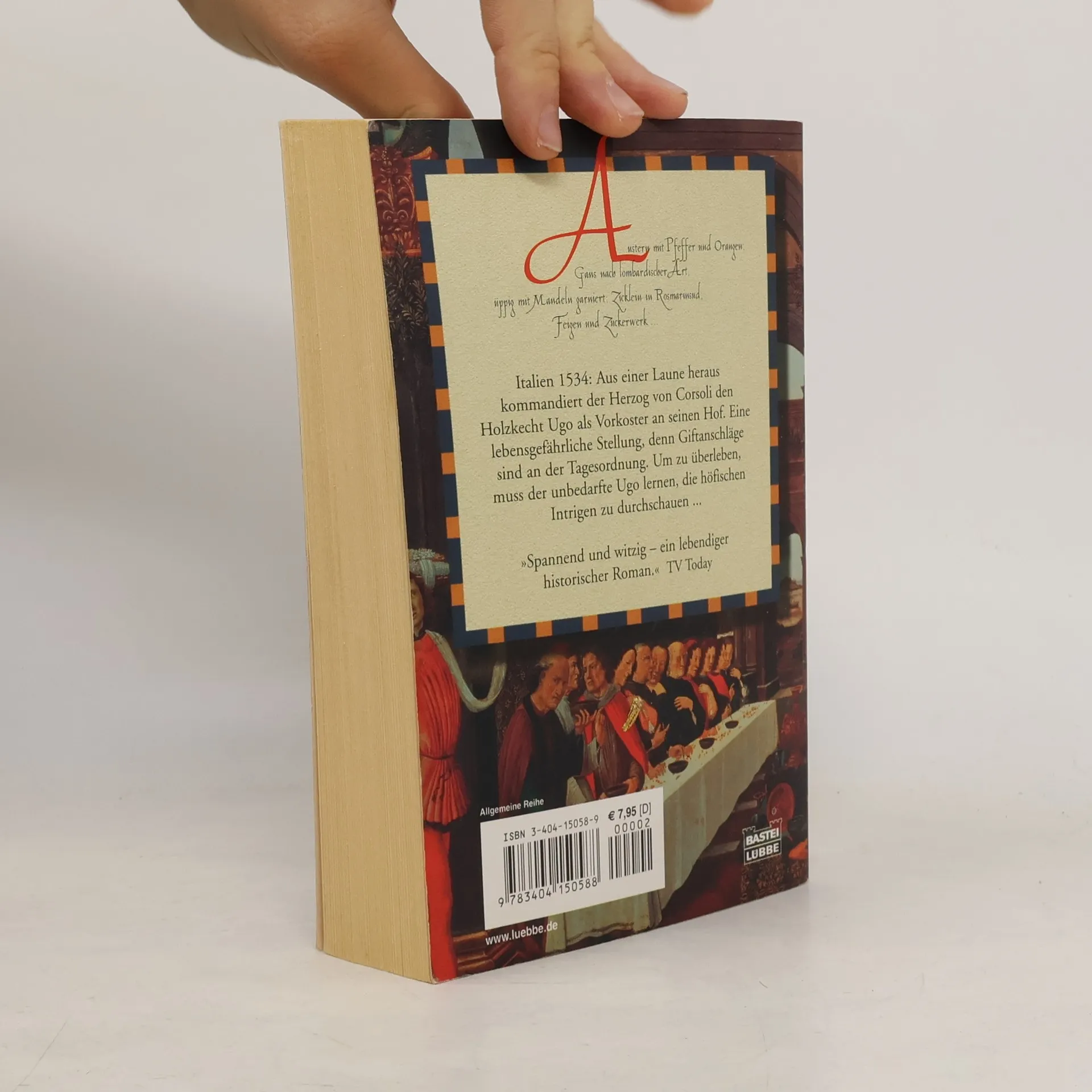 Umbrien 1534: Inmitten der Pest muss der junge Ugo DiFonte seine Heimat verlassen und arbeitet als Holzknecht. Bald verliebt er sich in die schöne Elisabetta, doch ihr Glück währt nicht lange, da sie bei der Geburt ihrer Tochter stirbt. Die kleine Miranda wird Ugos einziger Trost, doch er kann ihr die Entbehrungen nicht ersparen. Alles ändert sich, als der Herzog von Corsoli während einer Jagd auf Ugos bescheidene Behausung stößt und ihn samt Tochter in seinen prächtigen Palazzo bringt. Ugo wird zum Vorkoster ernannt, was sich als gefährliche Aufgabe herausstellt, da Giftanschläge auf den verhassten Fürsten an der Tagesordnung sind. Zu seinem Entsetzen erfährt Ugo, dass sein Vorgänger mit abgeschlagener Zunge tot im Festungsgraben liegt. Die Geschichte erzählt, wie Ugo vom unbedarften Burschen zum charmanten Höfling wird, der die Intrigen am Hof durchschaut und geschickt abwehrt. Die Düfte landestypischer Speisen würzen sein Leben, während er sich nach einer einfachen, ungefährlichen Mahlzeit sehnt. Der Hunger nach Freiheit und das Verlangen nach Liebe treiben ihn zu einem gewagten Plan. Ein stimmungsvoller historischer Roman aus der italienischen Renaissance, der Wärme, Zärtlichkeit und Genuss vermittelt.