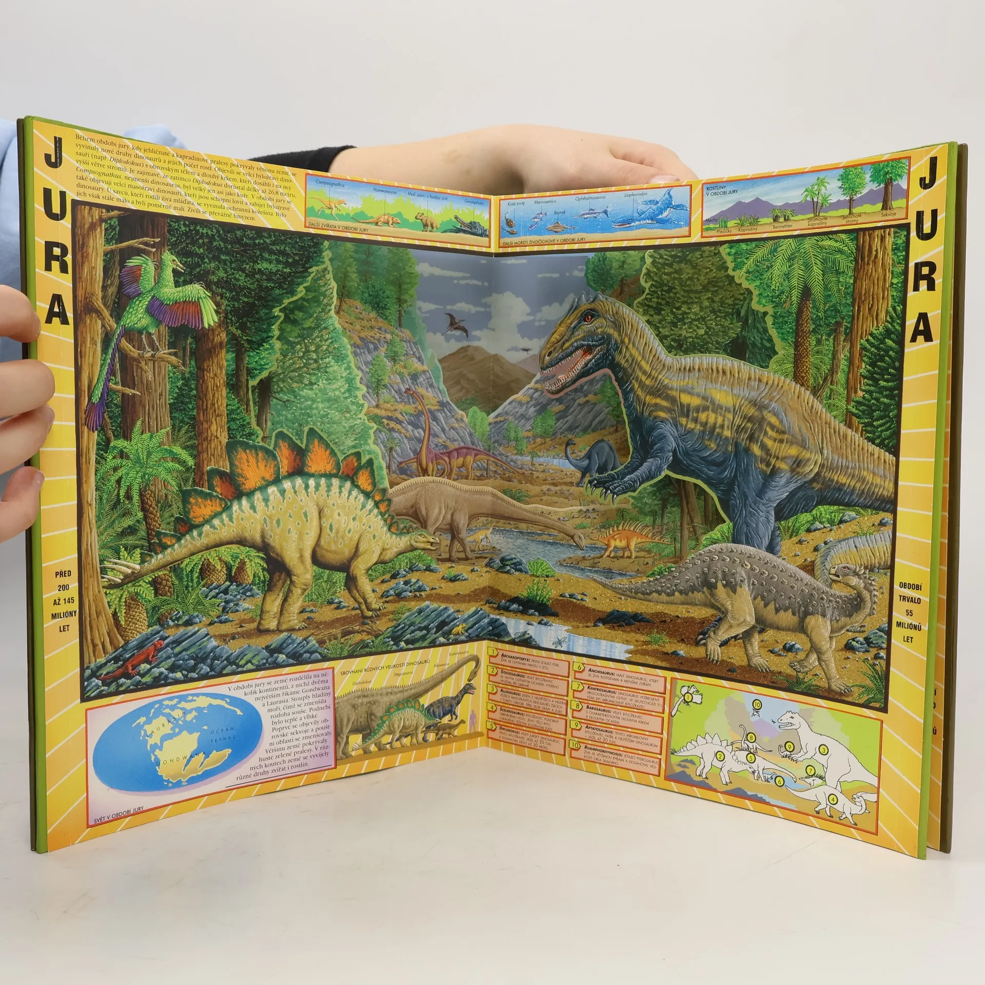 Jak vypadal náš svět před stovkami milionů let, dlouho před příchodem člověka? Knížka vám tajemství prehistorie poodhalí a přiblíží vám období triasu, jury a křídy. Dozvíte se, jaké klimatické podmínky tehdy panovaly i jaké rostliny v přírodě převládaly. Zavede vás mezi tehdejší obyvatele planety Země, jejichž velikost a rozmanitost v nás dodnes vyvolávají údiv – mezi dinosaury a pterosaury. Představí vám desítky druhů těchto tajuplných tvorů, jak mírumilovných býložravců, tak i nebezpečných dravců. Setkáte se však i s dalšími zvířaty té doby, mezi nimiž nechybí mořští živočichové nebo první savci. Unikátní 3D prezentace prehistorické éry vám pomohou navodit četné ilustrace. Díky netradičnímu zpracování knížky, kterou si můžete rozložit na stůl jako divadlo, se ocitnete přímo v druhohorách!
