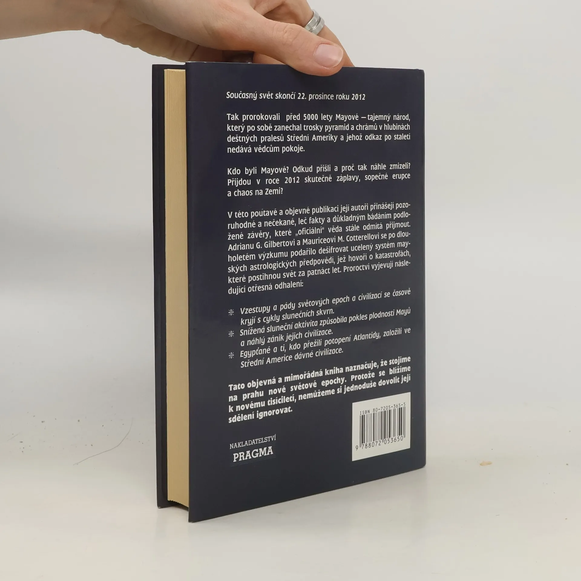 Podtitul: Odkrývání tajemství ztracené civilizace. V této poutavé a objevné publikaci její autoři přinášejí pozoruhodné a nečekané, leč fakty a důkladným bádáním podložené závěry, které „oficiální“ věda stále odmítá přijmout. Autorům se po dlouholetém výzkumu podařilo dešifrovat ucelený systém mayských astrologických předpovědí, jež hovoří o katastrofách, které postihnou svět za patnáct let. Proroctví vyjevují otřesná odhalení, jako jsou vzestupy a pády světových epoch a civilizací, snížená sluneční aktivita, sopečné erupce a chaos na Zemi. Z obsahu: Záhadní Mayové Mayská pojetí času Nová sluneční astrologie Maurice Cotterell v Mexiku Země chřestýše Nový oheň, Chac Moolové a lebka zkázy Transatlantické tradice Olmékové a Atlantida Slunce, jeho energie a vlivy Atlantické kataklyzma