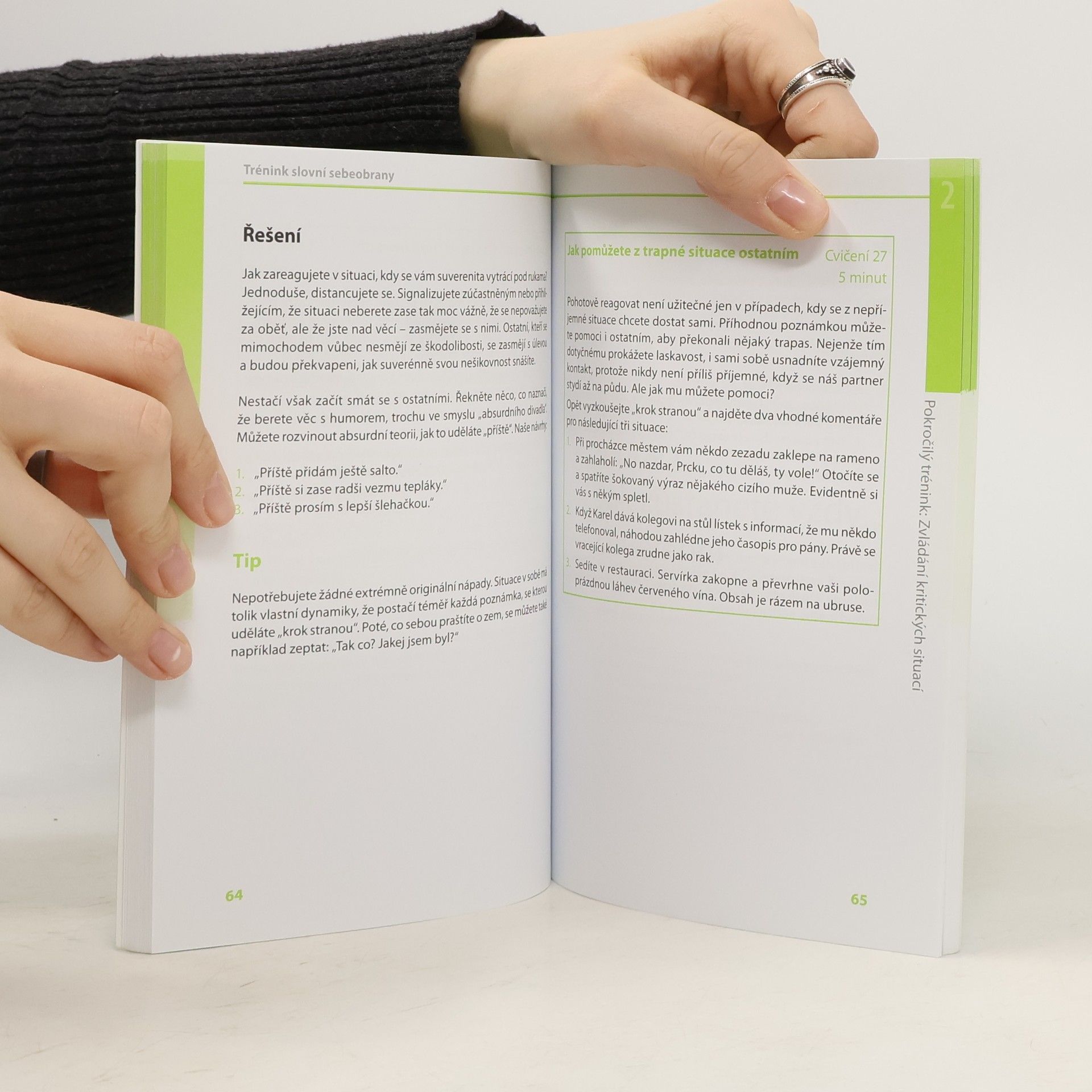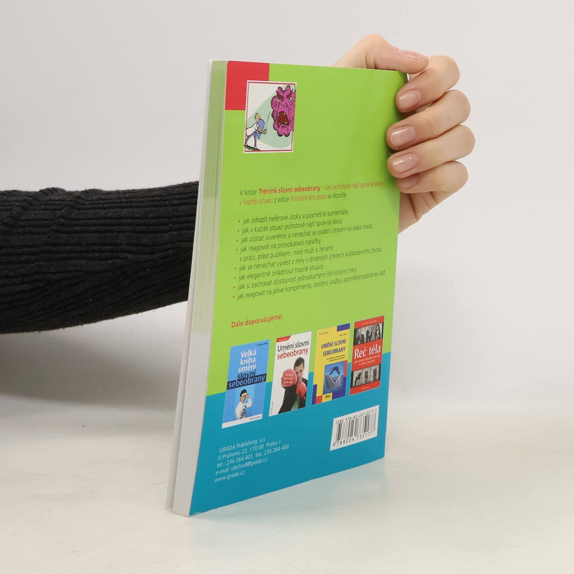 V knížce s padesáti cvičeními a mnoha praktickými tipy a radami si natrénujete, jak sebevědomě čelit slovním útokům a napadením. Když si osvojíte a v praxi vyzkoušíte všechny doporučené techniky a taktiky, uvidíte, že slovní sebeobrana není žádná věda. Projdete celým tréninkovým procesem - načerpáte rady, jak zůstat duchapřítomní a nenechat se ochromit nečekaným útokem, získáte přehled osvědčených jednoduchých frází, které zaručeně fungují, ale také tipy, jak vytvořit přesně mířené a přitom duchaplné odpovědi, které vám pomohou vyjít z nepříjemné situace suverénně. Díky mnoha konkrétním tipům a příkladům z reálného života se naučíte na slovní útoky a provokace reagovat pohotově, trefně i vtipně a budete schopni s přehledem ubránit svou důstojnost.