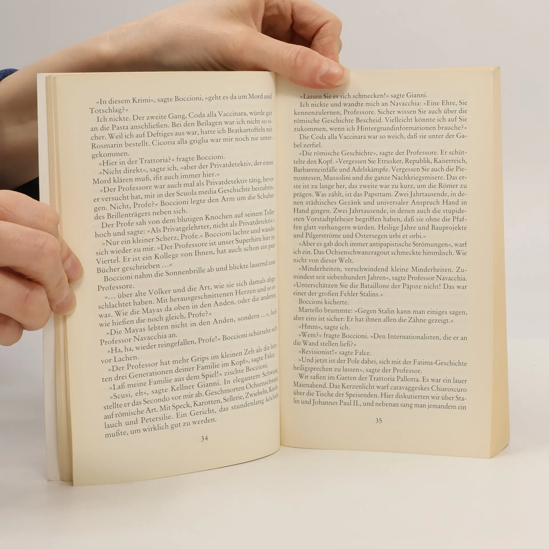 Ein mäßig bekannter Krimiautor begibt sich nach Rom, um den letzten Teil seiner Reihe zu vollenden und die Abgründe des Geschmacks zu erkunden. Trotz bescheidener Verkaufszahlen und hoher Recherchekosten hat er eine geniale Idee: Er will sich in einer Trattoria einquartieren, um sich von der römischen Küche verwöhnen zu lassen, im Gegenzug verspricht er, die Trattoria in seinem neuen Krimi prominent zu platzieren. Der Trattoriabesitzer Pallotta stimmt zu, und der Autor genießt köstliche Gerichte. Während er seinen Krimi über den römischen Privatdetektiv Brunetti schreibt, der sich mit Ehebruchsfällen über Wasser hält, wird ein Restaurantkritiker, den Brunetti beschattet, brutal ermordet. Verdächtig ist ausgerechnet Pallotta, in dessen Tochter Brunetti verliebt ist. Zwischen Leichen und geheimnisvollen Renaissancegemälden verfolgt Brunetti die Lösung des Falls und die Liebe seines Lebens. Doch je länger der Autor Brunetti durch Rom führt, desto bedrohlicher wird die Situation in der Trattoria. Ein Giftanschlag verdirbt den Gästen den Appetit, und die Grenze zwischen Realität und Fiktion verschwimmt unheimlich. Erfundene Figuren scheinen zum Leben zu erwachen, und als Pallotta ein opulentes Menü serviert, wird klar, dass es gefährlich werden könnte. Diese Geschichte ist eine Hommage an Rom und die römische Küche, ein spannender Krimi und eine intelligente Reflexion über das Schreiben von Krimis.
