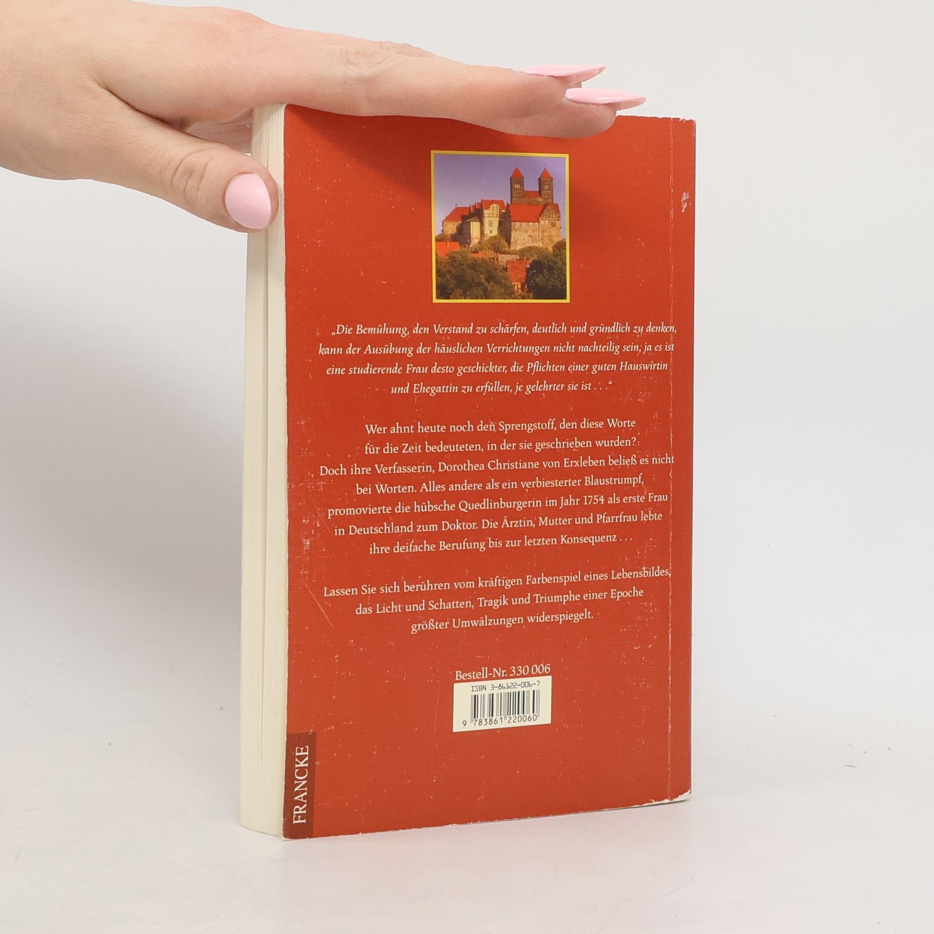 „Die Bemühung, den Verstand zu schärfen, deutlich und gründlich zu denken, kann der Ausübung der häuslichen Verrichtungen nicht nachteilig sein, ja es ist eine studierende Frau desto geschickter, die Pflichten einer guten Hauswirtin und Ehegattin zu erfüllen, je gelehrter sie ist.“ Wer ahnt heute noch den Sprengstoff, den diese Worte für die Zeit bedeuteten, in der sie geschrieben wurden? Doch ihre Verfasserin, Dorothea Christiane Erxleben, beließ es nicht bei Worten. Alles andere als ein verbiesterter Blaustrumpf, promovierte die hübsche Quedlinburgerin im Jahr 1754 als erste Frau in Deutschland zum Doktor. Die Ärztin, Mutter und Pfarrfrau lebte ihre dreifache Berufung bis zur letzten Konsequenz. Lassen Sie sich berühren vom kräftigen Farbenspiel eines Lebensbildes, das Licht und Schatten, Tragik und Triumphe einer Epoche größter Umwälzungen widerspiegelt.