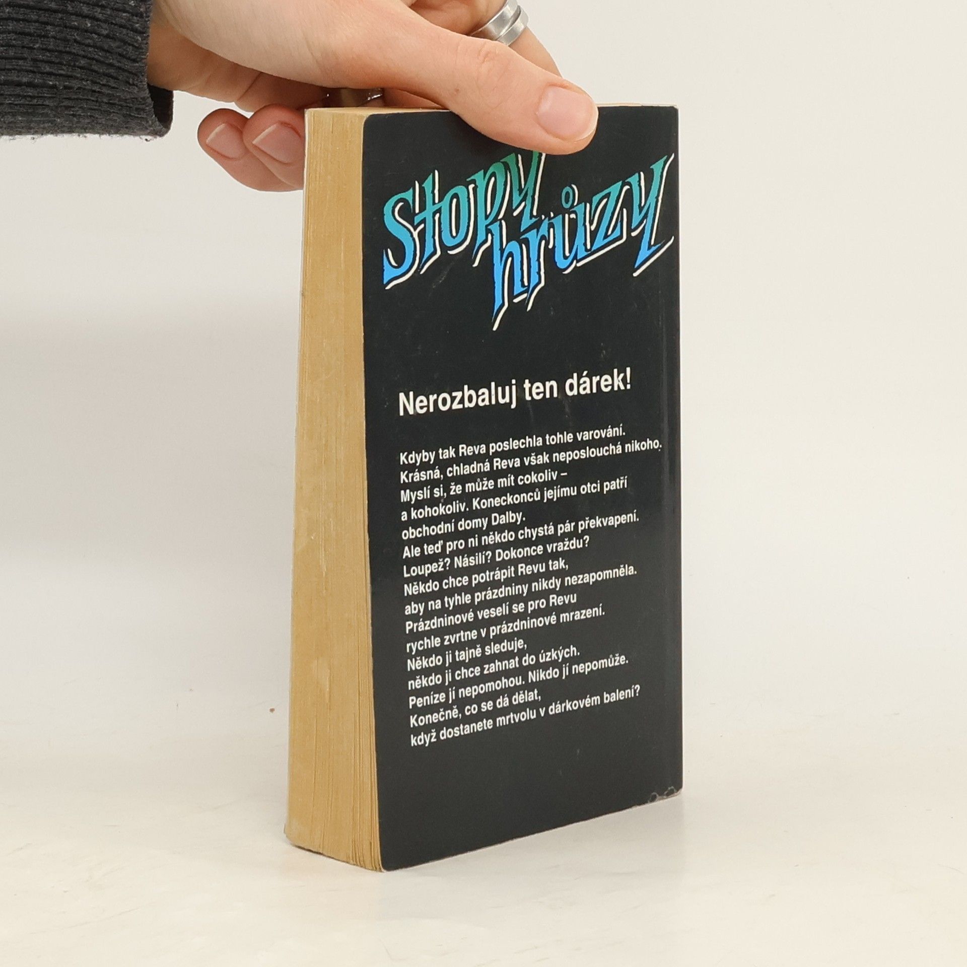 Stopy hrůzy 23, ze série Ulice strachu. „Nerozbaluj ten dárek!“ Kdyby tak Reva poslechla tohle varování. Krásná, chladná Reva však neposlouchá nikoho. Myslí si, že může mít cokoliv – a kohokoliv. Koneckonců jejímu otci patří obchodní dům Dalby. Ale teď pro ni někdo chystá překvapení. Loupež? Násilí? Dokonce vraždu? Někdo chce potrápit Revu tak, aby na tyhle prázdniny nikdy nezapomněla. Prázdninové veselí se pro Revu rychle zvrtne v prázdninové mrazení. Někdo ji tajně sleduje, někdo ji chce zahnat do úzkých. Peníze jí nepomohou. Nikdo jí nepomůže. Konečně, co se dá dělat, když dostanete mrtvolu v dárkovém balení?... celý text