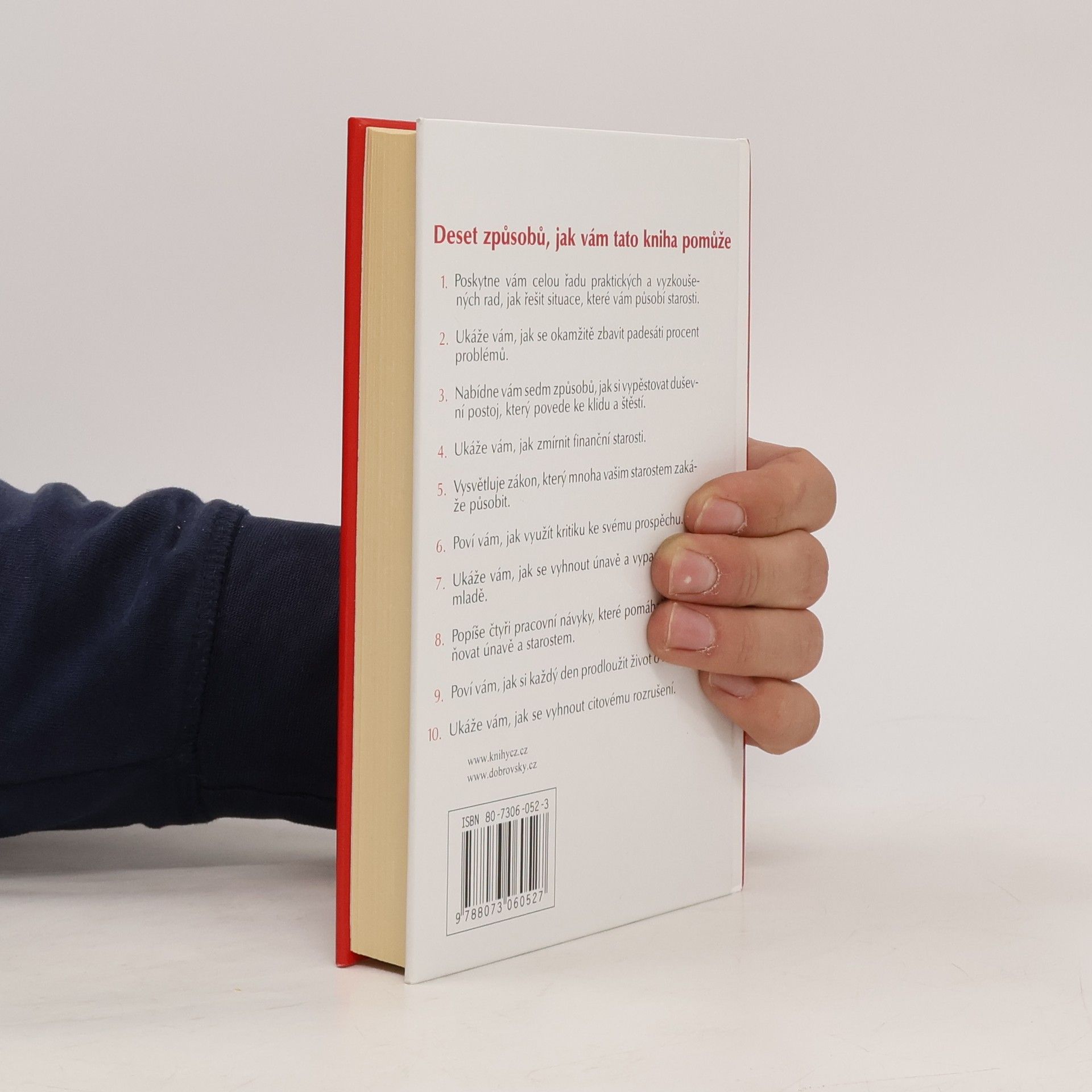 Deset způsobů, jak vám tato kniha pomůže: 1. Poskytne vám celou řadu praktických a vyzkoušených rad, jak řešit situace, které vám působí starosti. 2. Ukáže vám, jak se okamžitě zbavit padesáti procent problémů. 3. Nabídne vám sedm způsobů, jak si vypěstovat duševní postoj, který povede ke klidu a štěstí. 4. Ukáže Vám, jak zmírnit finanční starosti. 5. Vysvětluje zákon, který mnoha vašim starostem zakáže působit. 6. Poví vám, jak využít kritiku ke svému prospěchu. 7. Ukáže vám, jak se vyhnout únavě a vypadat pořád mladě. 8. Popíše čtyři pracovní návyky, které pomáhají zabraňovat únavě a starostem. 9. Poví vám, jak si každý den prodloužit život o hodinu. 10. Ukáže vám, jak se vyhnout citovému rozrušení.