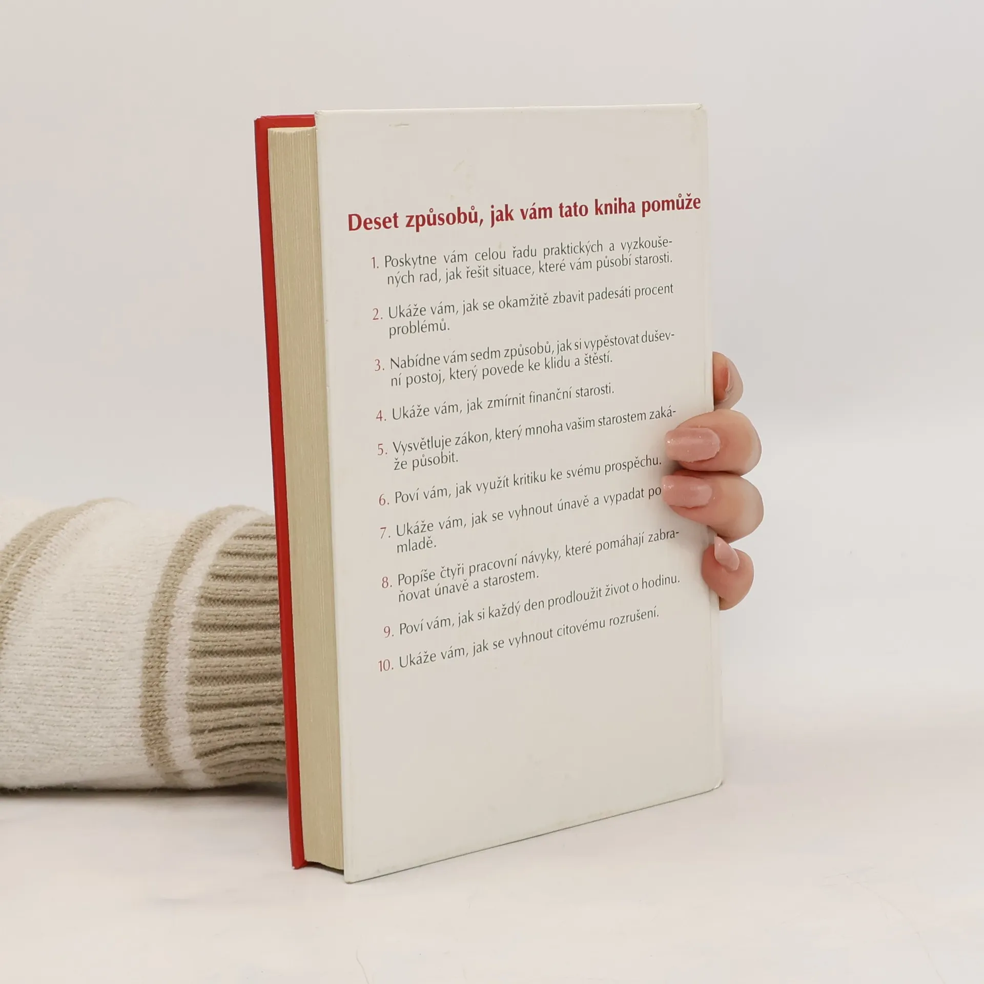 Deset způsobů, jak vám tato kniha pomůže: 1. Poskytne vám celou řadu praktických a vyzkoušených rad, jak řešit situace, které vám působí starosti. 2. Ukáže vám, jak se okamžitě zbavit padesáti procent problémů. 3. Nabídne vám sedm způsobů, jak si vypěstovat duševní postoj, který povede ke klidu a štěstí. 4. Ukáže Vám, jak zmírnit finanční starosti. 5. Vysvětluje zákon, který mnoha vašim starostem zakáže působit. 6. Poví vám, jak využít kritiku ke svému prospěchu. 7. Ukáže vám, jak se vyhnout únavě a vypadat pořád mladě. 8. Popíše čtyři pracovní návyky, které pomáhají zabraňovat únavě a starostem. 9. Poví vám, jak si každý den prodloužit život o hodinu. 10. Ukáže vám, jak se vyhnout citovému rozrušení. (méně textu)