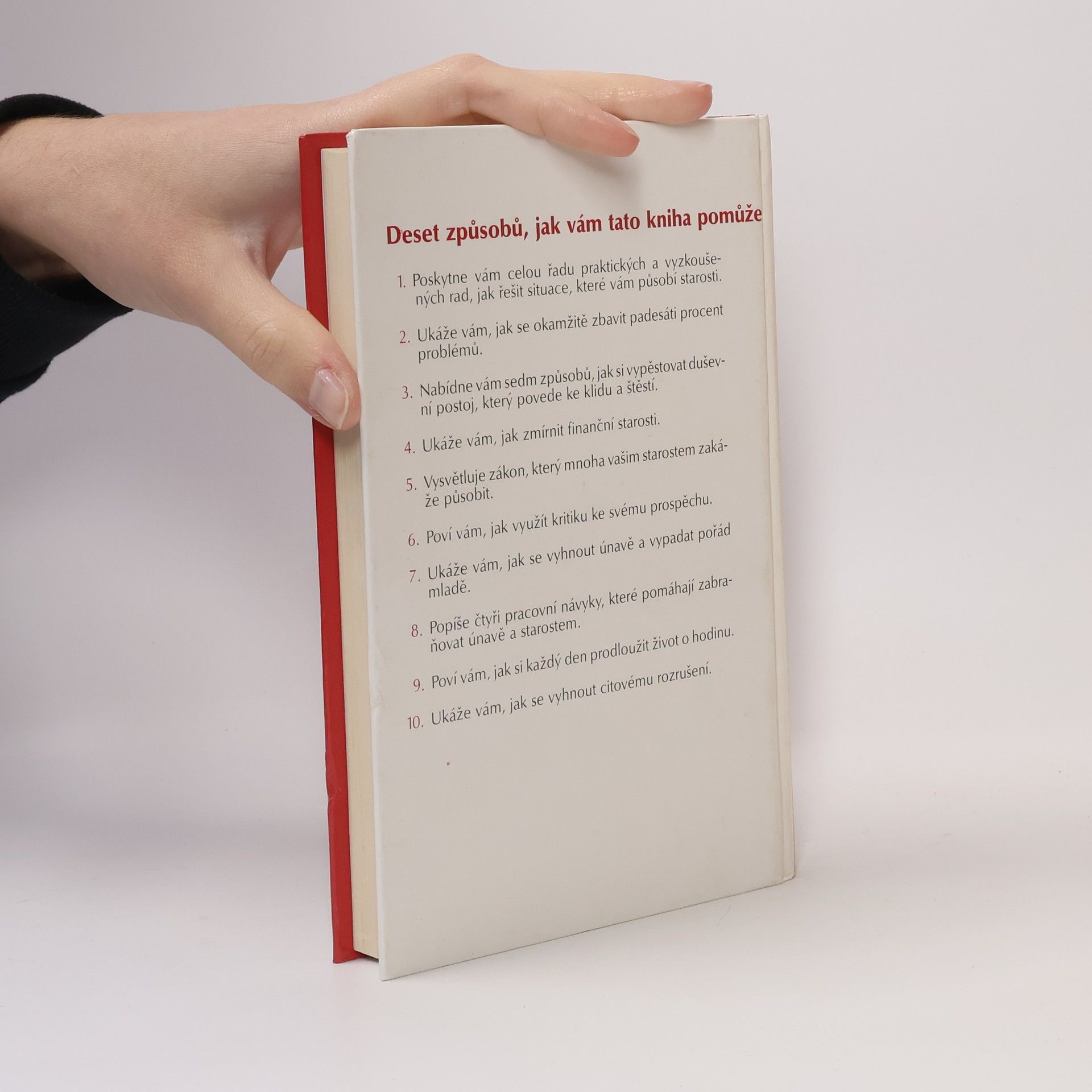 Deset způsobů, jak vám tato kniha pomůže: 1. Poskytne vám celou řadu praktických a vyzkoušených rad, jak řešit situace, které vám působí starosti. 2. Ukáže vám, jak se okamžitě zbavit padesáti procent problémů. 3. Nabídne vám sedm způsobů, jak si vypěstovat duševní postoj, který povede ke klidu a štěstí. 4. Ukáže Vám, jak zmírnit finanční starosti. 5. Vysvětluje zákon, který mnoha vašim starostem zakáže působit. 6. Poví vám, jak využít kritiku ke svému prospěchu. 7. Ukáže vám, jak se vyhnout únavě a vypadat pořád mladě. 8. Popíše čtyři pracovní návyky, které pomáhají zabraňovat únavě a starostem. 9. Poví vám, jak si každý den prodloužit život o hodinu. 10. Ukáže vám, jak se vyhnout citovému rozrušení. (méně textu)