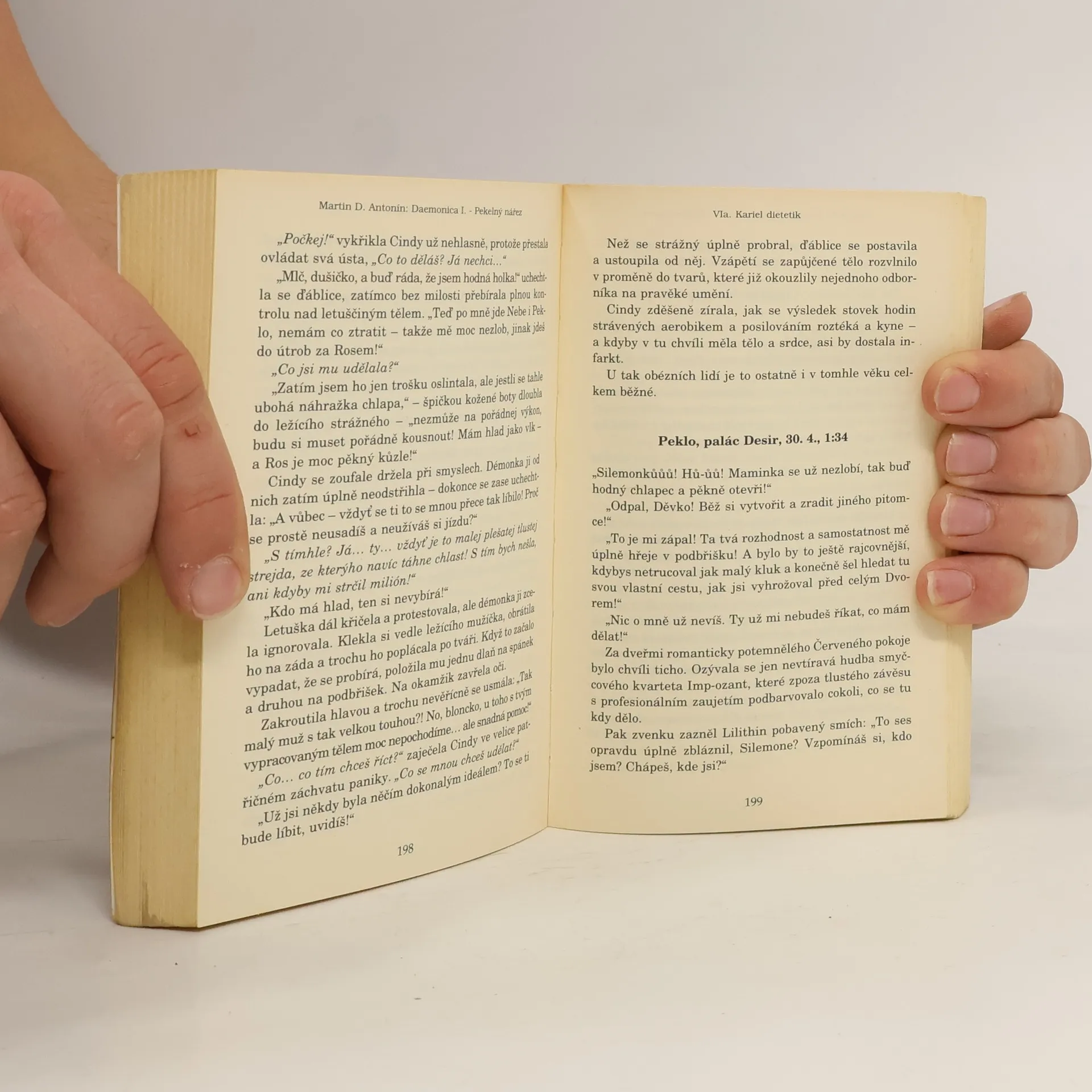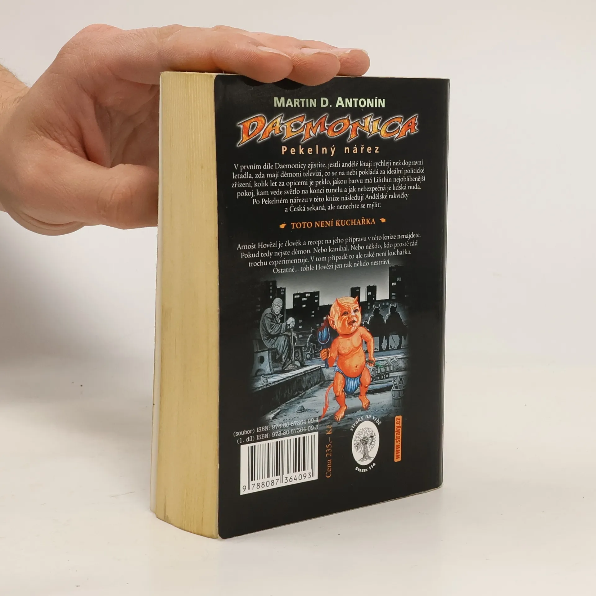 V prvním díle Daemonicy zjistíte, jestli andělé létají rychleji než dopravní letadla, zda mají démoni televizi, co se na nebi pokládá za ideální politické zřízení, kolik let za opicemi je peklo, jakou barvu má Lilithin nejoblíbenější pokoj, kam vede světlo na konci tunelu a jak nebezpečná je lidská nuda. Toto není kuchařka. Arnošt Hovězí je člověk a recept na jeho přípravu v této knize nenajdete. Pokud tedy nejste démon. Nebo kanibal. Nebo někdo, kdo prostě rád trochu experimentuje. V tom případě to ale také není kuchařka. Ostatně... tohle Hovězí jen tak někdo nestráví.