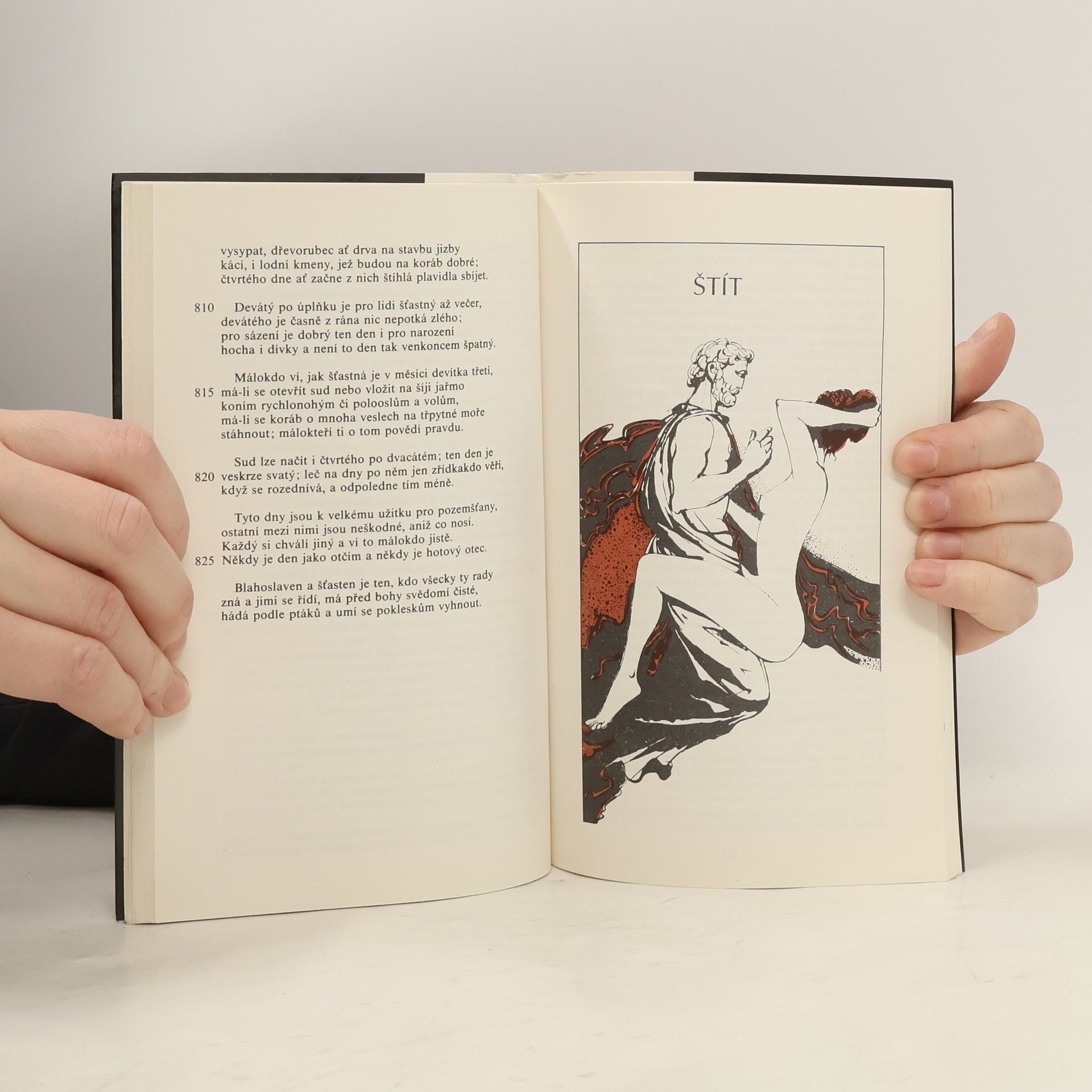 Výbor z díla slavného řeckého básníka obsahuje slavný epos na práci rolníka (Práce a dny), básně z mytologické oblasti (Zrození bohů) a další menší fragmenty z jeho díla (Štít). Námětem první skladby je život a práce rolníka a přináší řadu reálií z venkovského života, druhá báseň zcela spadá do mytologie a pokouší se uvést do souladu chaotický svět řeckých božstev. Třetí část Hésiodova díla líčí dramatický souboj Hérakleův s lupičem Kyknem. Četba je doplněna poznámkami a zasvěcenou předmluvou. Neprodejná prémie antické knihovny 1988-1990. Všechna díla jsou napsána hexametrem.