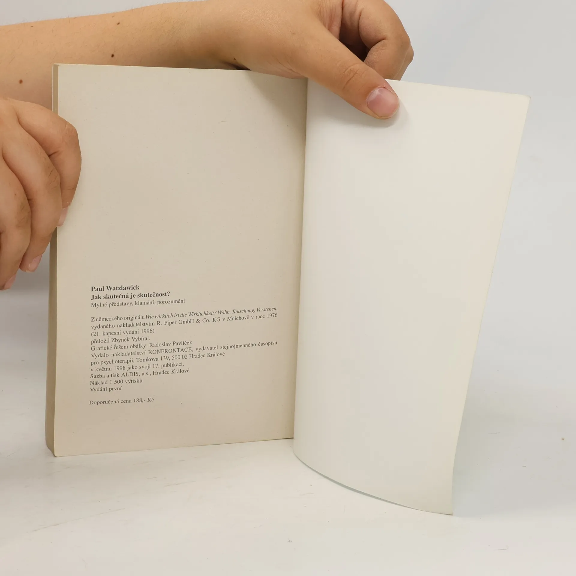 Skutečnost, jak ji vnímáme, je výsledkem komunikace, ta však podléhá nejrůznějším záměrným i nezáměrným zkreslením. Člověk věří, že jeho vlastní pohled na skutečnost, to, jak ji vnímá je skutečnost sama, tedy "pravda". Autor na mnoha příkladech z psychoterapeutické praxe, histo- rie i literatury ukazuje, kolika klamy, šumy, psychickými bloky a dezinformacemi je naše vnímání ovlivněno, jak nepostřehnutelně může být posunuto či záměrně manipulováno. Seznamuje s výsledky experimentů z oblasti výzkumu komunikace a chování, s principy komunikace obecně, všímá si i neverbální komunikace. Upozorňuje na nebezpečí mesianistických jedinců či ideologií vnucujících své vidění světa a objasňuje metody vymývání mozků. Závěrem podává historický přehled snah o komunikaci se zvířaty a s mimozemskými civilizacemi. Čtivý, přitom velmi erudovaný text je doplněn rozsáhlou bibliografií.