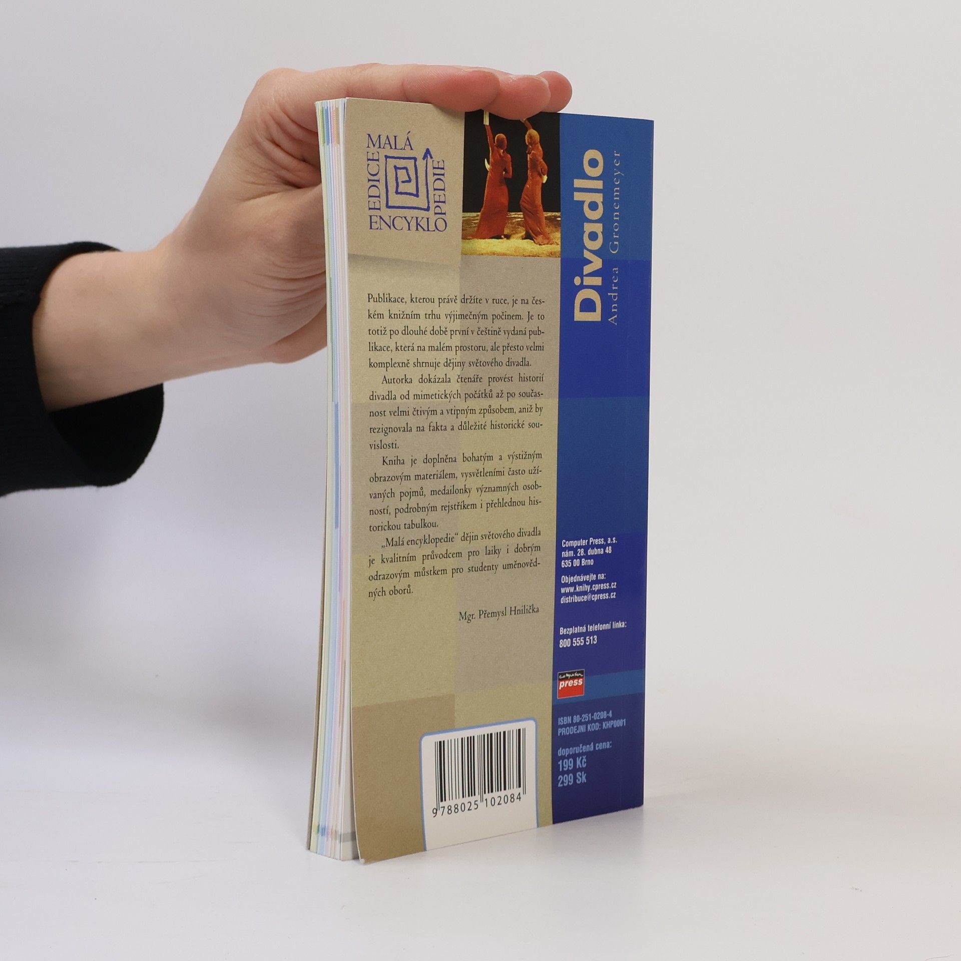 Průvodce dějinami světového divadla se v základních heslech zabývá jednotlivými etapami od starověku až po divadlo současnosti. Krátké charakteristiky historických období jsou doplněny stručnými informacemi o významných osobnostech dramatiků, herců a režisérů. Kniha je doplněna barevnými a černobílými fotografiemi, slovníčkem divadelních pojmů, odkazy na některé evropské divadelní instituce a rejstříky. Malá encyklopedie je edice populárně-naučných knih je určena každému, kdo si rád doplňuje znalosti a hledá souvislosti. Dějiny oborů spojených s uměním jako je divadlo, film či opera, ale také zahradní architektura, jsou zde popisovány od prvních dochovaných zmínek až do současnosti. Každý titul obsahuje přes 200 barevných a černobílých fotografií, medailonky významných osobností, chronologické linky a slovníček nejdůležitějších pojmů. Čtivé vyprávění o historii doplňují rejstříky a seznam světových institucí, které se daným tématem zabývají.... celý text