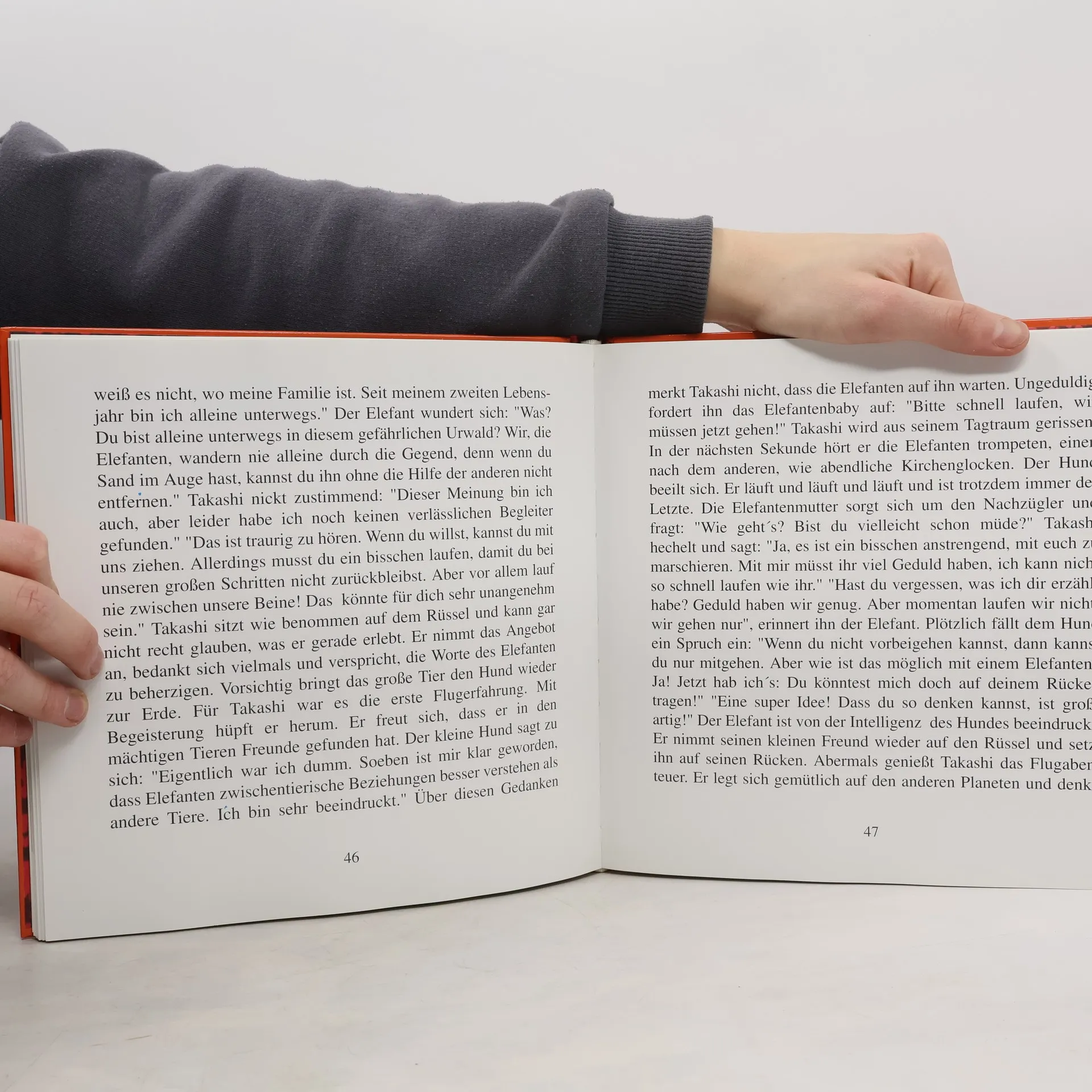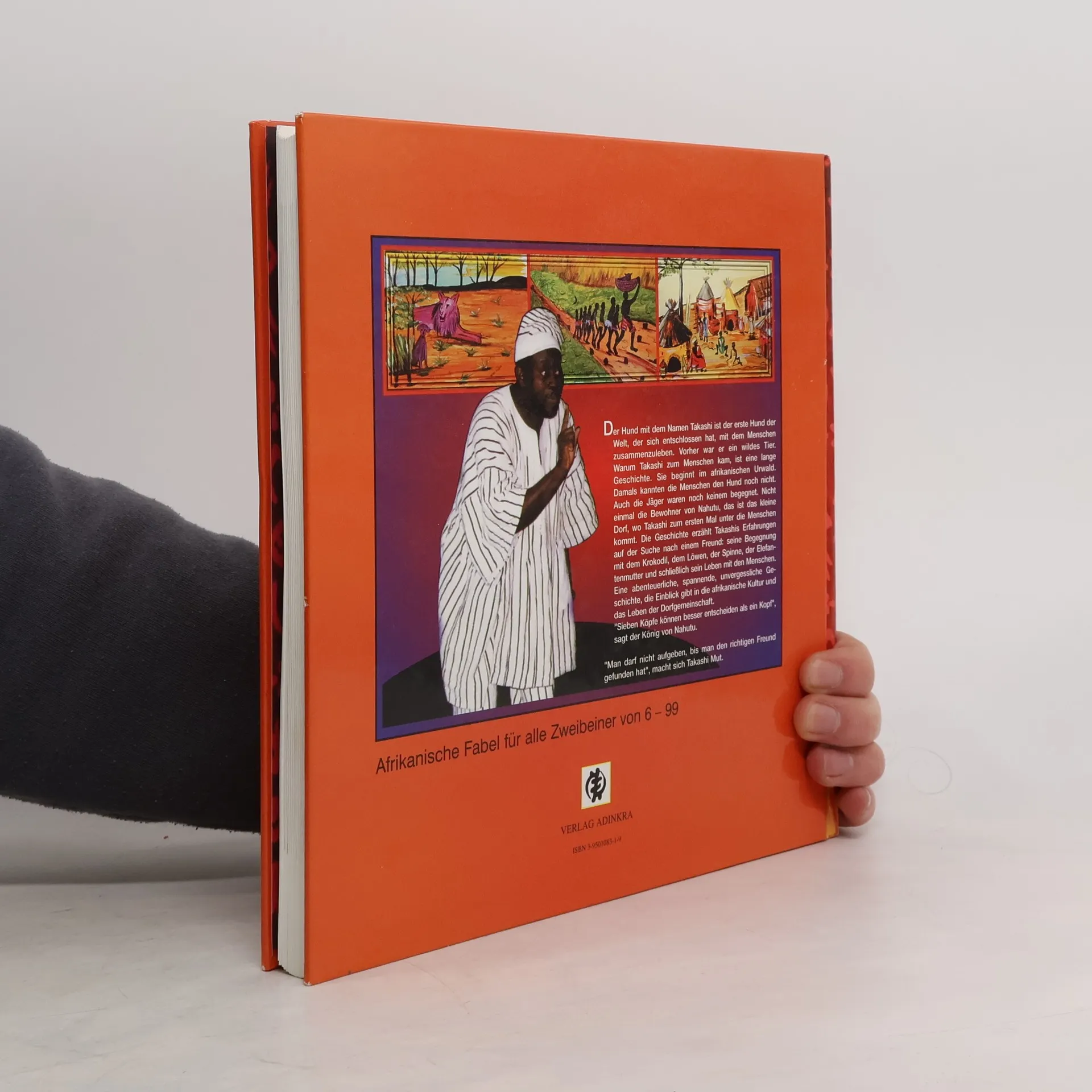 Der Hund mit dem Namen Takashi ist der erste Hund der Welt, der sich entschlossen hat, mit dem Menschen zusammenzuleben. Vorher war er ein wildes Tier. Warum Takashi zum Menschen kam, ist eine lange Geschichte. Sie beginnt im afrikanischen Urwald, Damals kannten die Menschen den Hund noch nicht. Auch die Jäger waren noch keinem begegnet. Nicht einmal die Bewohner von Nahutu, dass ist das kleine Dorf, wo Takashi zum ersten Mal unter die Menschen kommt. Die Geschichte erzählt Takashis Erfahrungen auf der suche nach einem Freund: seine mit dem Krokodil, der Elefantenmutter und schließlich sein Leben mit den Menschen. Eine abenteuerliche, spannende, unvergessliche Geschichte, die Einblick gibt in die afrikanische Kultur und das Leben der Dorfgemeinschaft. „Man darf nicht aufgaben, bis man den richtigen Freund gefunden hat“, macht sich Takashi Mut. Afrikanische Fabel für alle Zweibeiner von 6-99
