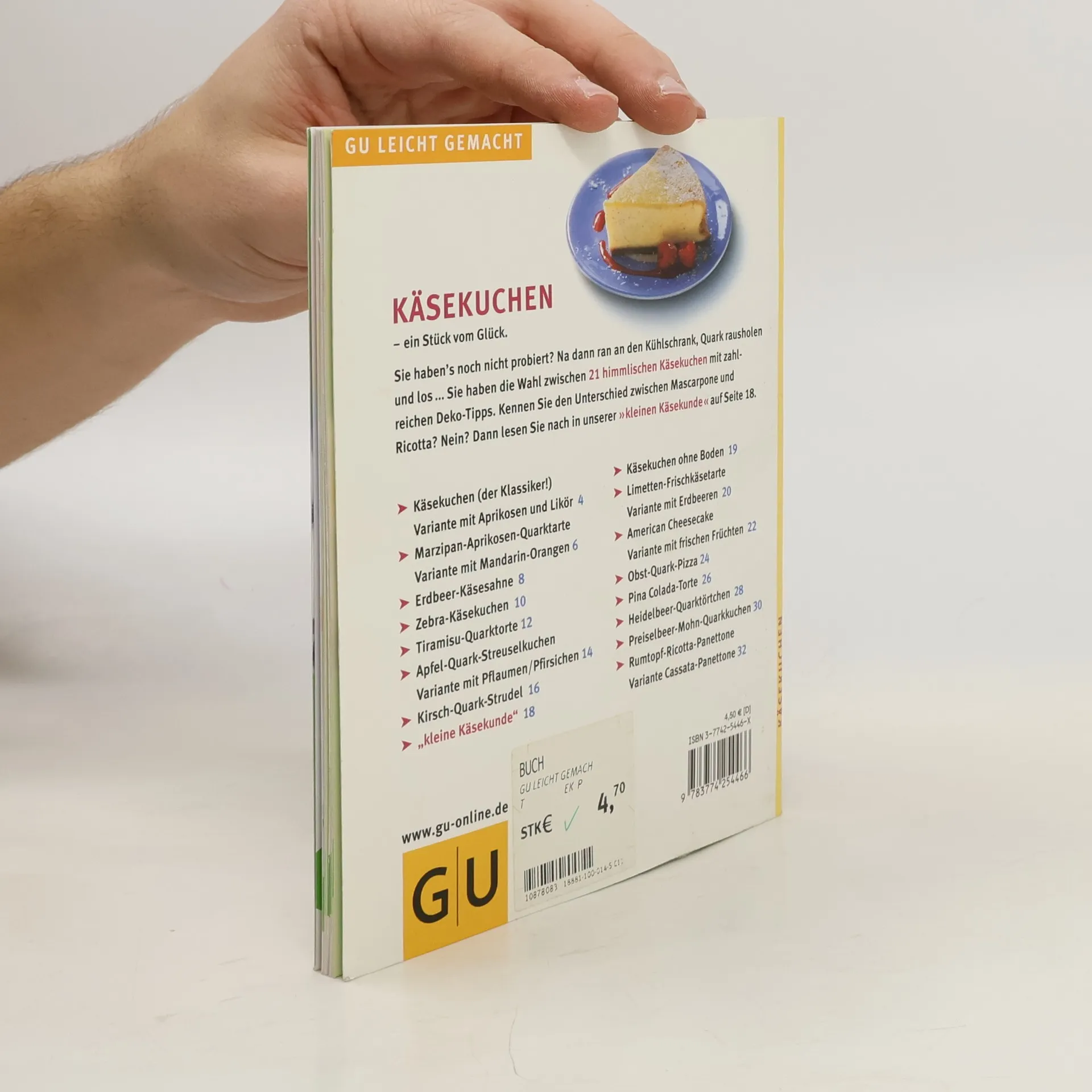 Kaesekuchen – ein Stueck vom Glueck! Goldgelb gebacken und innen weiss, sahnig und unendlich saftig: Kaesekuchen ist der Klassiker unter den Kuchen und Torten. Und weil diesem goldgelben Kuchentraum kaum jemand widerstehen kann und er selbst gemacht einfach am besten schmeckt, zeigen wir, wie einfach es ist, diesen Traum selbst zu verwirklichen. Ob mit oder ohne Rosinen, Obst oder Streuseln, immer wieder praesentiert er sich verfuehrerisch vielseitig. Beliebte Klassiker und neue, frische, trendige Rezept- ideen finden Sie in diesem Buechlein. Denn bei Kaesekuchen werden selbst jene gerne mal schwach, die Suesses eigentlich gar nicht so sehr moegen.