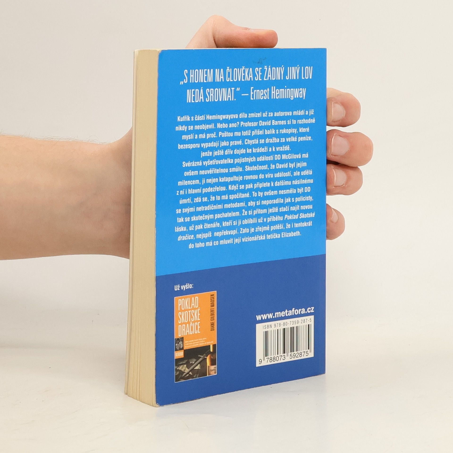 Kufřík s částí Hemingwayova díla zmizel už za autorova mládí a již nikdy se neobjevil. Nebo ano? Profesor David Barnes si to rozhodně myslí a má proč. Poštou mu totiž přišel balík s rukopisy, které vypadají jako pravé. Chystá se dražba, jenže ještě dřív dojde k vraždě. Svérázná vyšetřovatelka pojistných událostí DD McGilová má ovšem neuvěřitelnou smůlu. Skutečnost, že David byl jejím milencem, ji nejen katapultuje rovnou do víru událostí, ale udělá z ní i hlavní podezřelou. To by ovšem nesměla být DD se svými netradičními metodami, aby si neporadila jak s policisty, tak se skutečným pachatelem.