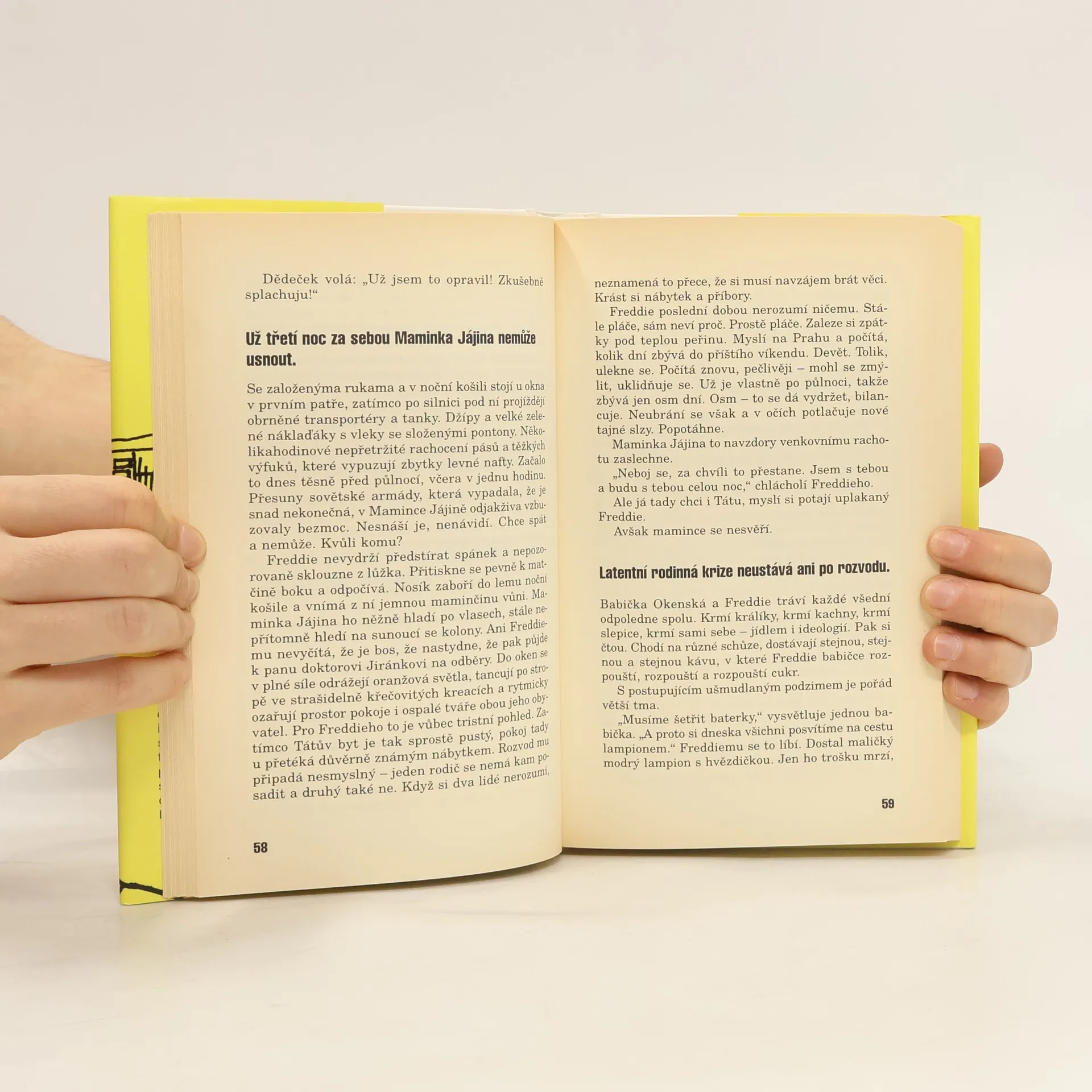 Rodina vypravěče Freddieho- rozvedení rodiče, dvě babičky, dědeček, strýc- patří svou podstatou do rodu šabachovských postaviček, jež si tvrdohlavě ponechávají přirozený naturel navzdory cloumání osudem. Citlivý Freddie je sice dítětem zmírající normalizační éry, ale začíná glosovat svět především poté, kdy totalitní jistotu sevřenosti vystřídá vysilující bezbřehost svobody. Maminka opustí neperspektivní sféru zemědělství a začne potírat zločin, táta se vrhá na podnikání, strýc po návratu ze stáže v Británii si poněkud upachtěně nasazuje masku tvrdého byznysmena, zatímco ubohý dědeček se stává obětí velkorysého zásilkového obchodu, rozhazujícího milionové částky, osobní automobily a televizory Sony za pětatřicet tisíc. Devadesátá léta se pro Freddieho rodinu přemění v nežádanou maturitu života. Jak úspěšně ji překonají?