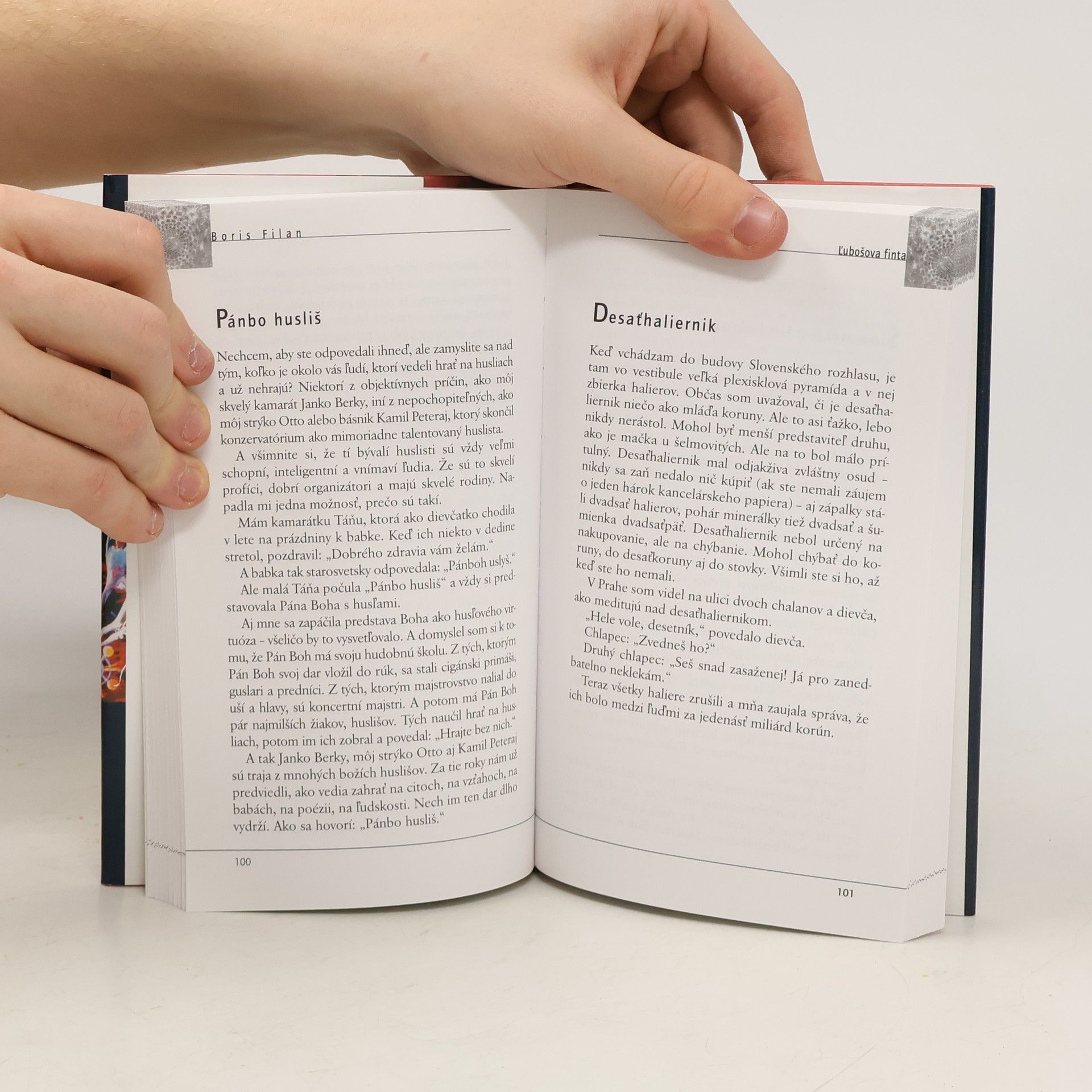 "V knihe Ľubošova finta sú väčšinou príbehy z rozhlasovej Pálenice Borisa Filana. Teší ma, že mi v rozhlase celé roky poskytujú taký priestor. Keby som mal sám seba namaľovať, bol by to obraz stromu. Na jeho konáre by sadali vtáci neskutočných príhod a voňavých kníh. Celý život pozorujem, prežívam a čítam neuveriteľné vecí, ale tú naozajstnú radosť z nich cítim, až keď o nich niekomu porozprávam. Môže vám to potvrdiť práve Ľuboš, môj najdávnejší kamarát a sused. Ako chalan som k nim do bytu vbehol aspoň desaťkrát za deň. A hneď od dverí som zo seba sypal, čo úžasné som v ten deň videl, čítal a počul. Napríklad, čo povedala nášmu kuričovi jeho manželka, keď jej priniesol k MDŽ snežienky. Sú situácie, myšlienky a obrazy, ktoré ma oslnia ako stowatová žiarovka za slnečného dňa."