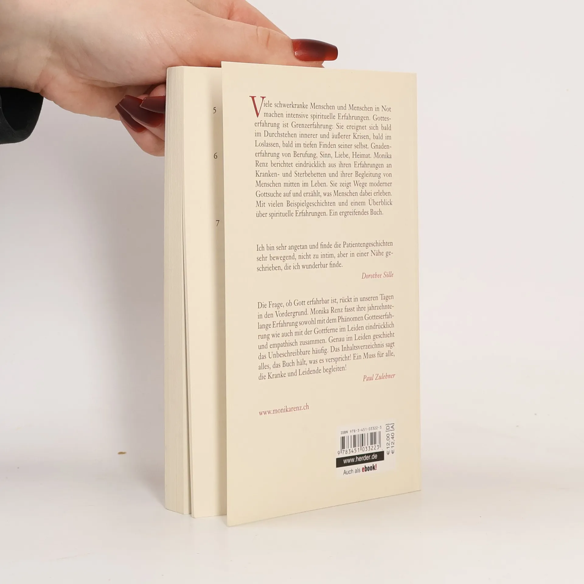 Viele schwerkranke Menschen und Menschen in Not machen intensive spirituelle Erfahrungen. Gotteserfahrung ist Grenzerfahrung: Sie ereignet sich bald im Durchstehen innerer und äußerer Krisen, bald im Loslassen, bald im tiefen Finden seiner selbst. Gnadenerfahrung von Berufung, Sinn, Liebe, Heimat. Monika Renz berichtet eindrücklich aus ihren Erfahrungen an Kranken- und Sterbebetten und ihrer Begleitung von Menschen mitten im Leben. Sie zeigt Wege moderner Gottsuche auf, und erzählt, was Menschen dabei erleben. Gott wird ganz von der Erfahrung her erahnt: als Sein oder Kraft, als Bundespartner und Beziehung. Mit vielen Beispielgeschichten und einem Überblick über spirituelle Erfahrungen. Ein ergreifendes Buch.