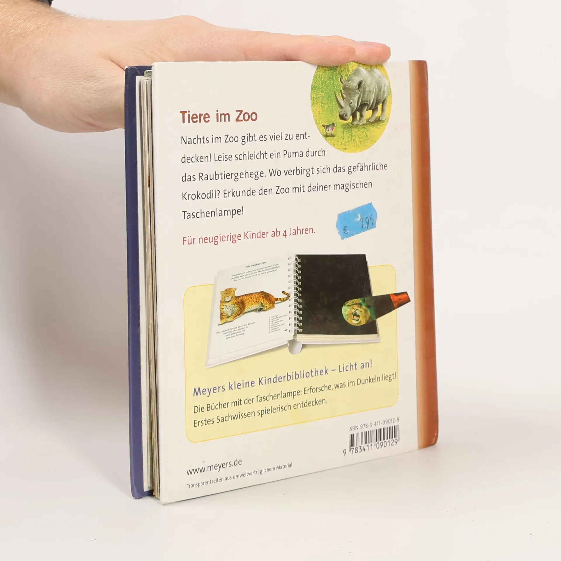 In der spannenden Sachbilderbuchreihe „Meyers kleine Kinderbibliothek - Licht an!“ entdecken kleine Forscher, was normalerweise im Dunkeln liegt. Mit der beiliegenden „Taschenlampe“ aus Papier können Kinder ab 4 Jahren unter den Entdeckerfolien gezielt bunte Szenen „beleuchten“ und in verborgene Welten eintauchen. In diesem Band lernen Kinder spielerisch, welche Tiere man im Zoo bewundern kann, welche Raubkatzen, Steppentiere, Vögel, Affen und Wassertiere es gibt, was ihre besonderen Merkmale sind, was ein Terrarium ist und welche Tiere dort gehalten werden.