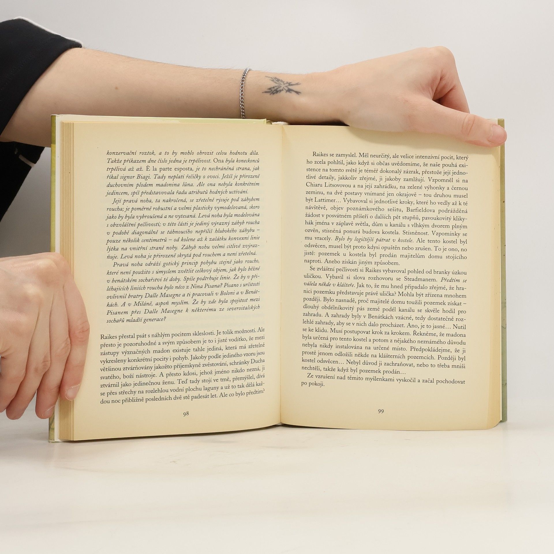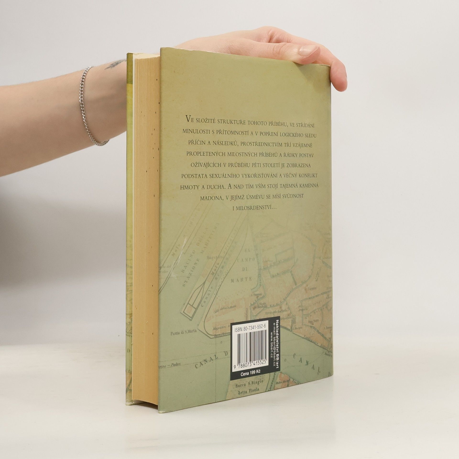 Děj napínavého historického románu se odvíjí od nálezu sošky kamenné benátské madony a odehrává se v několika časových rovinách. Třiatřicetiletý Angličan Simon Raikes restauruje v Benátkách vzácnou gotickou madonu, která ho přitahuje svou tajuplností. S odstraňováním nánosu věků z její tváře a šatu postupně odhaluje i její příběh, jenž ho zavádí až do 15. a 18. století. Historie lásky a zločinu provází Simona i v současnosti, kdy prožívá milostné opojení ženou z rodu Fornarini, úzce spjatého s madonou, a stává se svědkem podezřelé smrti jejího manžela. Působivý propletenec neřesti, cudnosti, zrady a umělecké vášně je složen z plnokrevných výpovědí několika století.