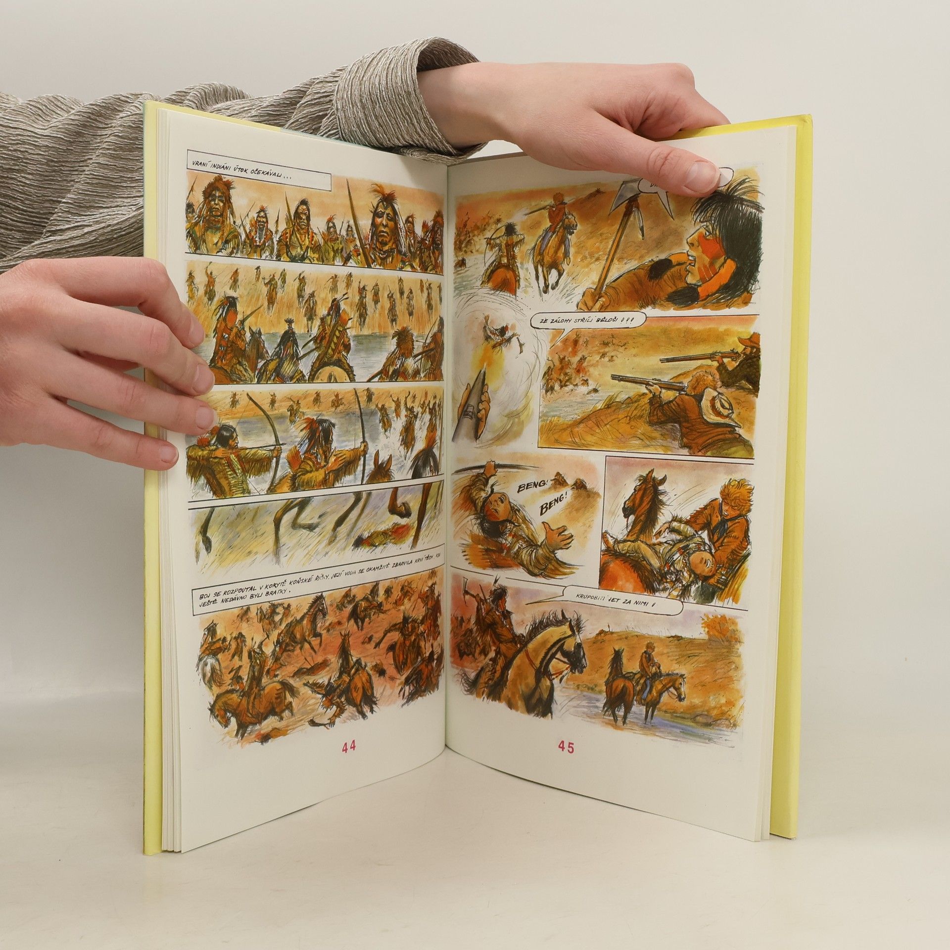 Dobrodružství na Oregonské stezce. Kreslený román z Divokého západu, který napínavým dějem přibližuje historiské události na Oregonské stezce, kde vrcholí boj Indiánů o jejich práva. Hrdiny příběhu jsem dva chlapci, idiánský chlapec Krupobití a bělošský chlapec Dick Thompson, kteří se spřátelí za dramatických okolností. Jejich kamarádství je vystaveno četným zkouškám. Prožívají spolu i všední dny v indiánské vesnici, kdy Dick objevuje dobré i špatné stránky indiánské života... Jejich cesty se ovšem rozdělí, ale události je po čase opět svedou dohromady, ale každý už stojí na jiné straně a hájí zájmy své rasy...... celý text
