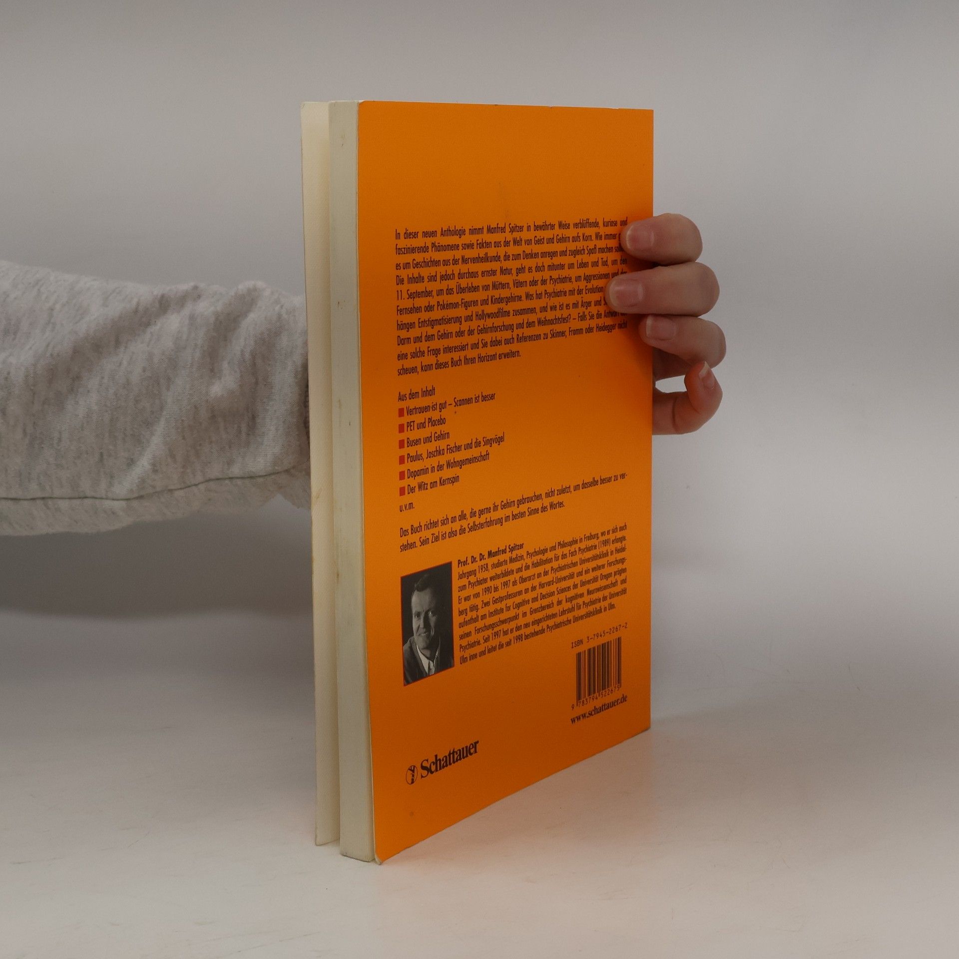 In dieser neuen Anthologie nimmt Manfred Spitzer in bewährter Weise verblüffende, kuriose und faszinierende Phänomene sowie Fakten aus der Welt von Geist und Gehirn aufs Korn. Wie immer geht es um Geschichten aus der Nervenheilkunde, die zum Denken anregen und zugleich Spaß machen sollen. Die Inhalte sind jedoch durchaus ernster Natur, geht es doch mitunter um Leben und Tod, um den 11. September, um das Überleben von Müttern, Vätern oder der Psychiatrie, um Aggressionen und das Fernsehen oder Pokémon-Figuren und Kindergehirne. Was hat Psychiatrie mit der Evolution zu tun, wie hängen Entstigmatisierung und Hollywoodfilme zusammen, und wie ist es mit Ärger und Strafe, dem Darm und dem Gehirn oder der Gehirnforschung und dem Weihnachtsfest? - Falls Sie die Antwort auf solche Fragen interessiert und Sie dabei auch Referenzen zu Skinner, Fromm oder Heidegger nicht scheuen, kann dieses Buch Ihren Horizont erweitern. Aus dem Inhalt Vertrauen ist gut, scannen ist besser PET und Placebo Busen und Gehirn Paulus, Joschka Fischer und die Singvögel Dopamin in der Wohngemeinschaft Von der Beschäftigung zur Ko-Therapie Der Witz am Kernspin u. v. m. Das Buch richtet sich an alle, die gerne ihr Gehirn gebrauchen, nicht zuletzt, um dasselbe besser zu verstehen. Sein Ziel ist also die Selbsterfahrung im besten Sinne des Wortes.