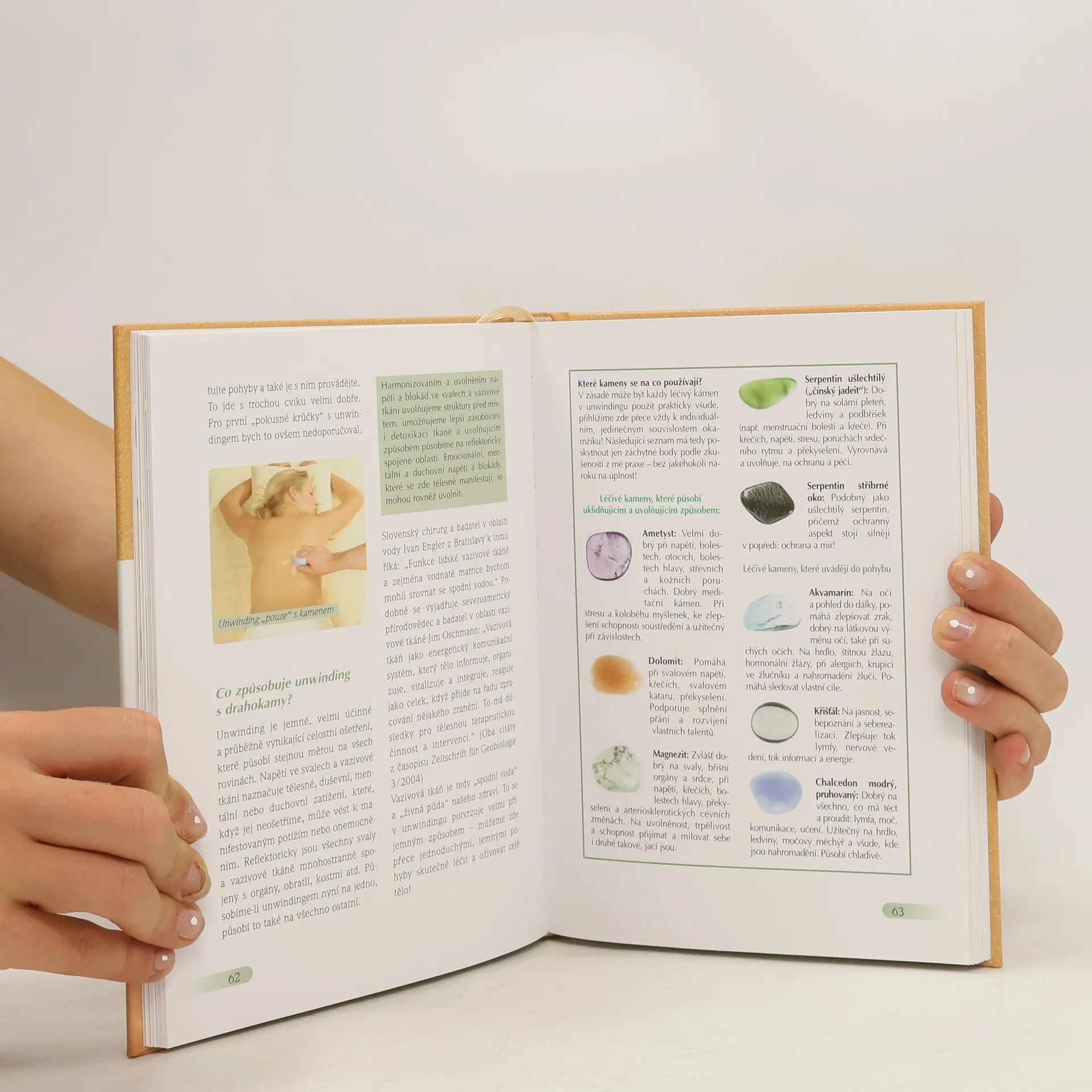 Každý z nás touží po doteku… Nechte se touto knihou uvést do zvláštního světa masáže, v němž za vás pracují drahé kameny. Možná se vám bude zdát tato metoda poněkud nelogická, protože kameny obvykle považujeme za tvrdé, těžké a studené: budete se ovšem divit, jak doukážou „změknout“, jak jemně s pokožkou i tělem zacházejí a jakou lehkost ve vás mohou navodit! Masáže pomocí drahokamů spojují přednosti intenzivní dotykové masáže s harmonizující, léčivou energií přírodních minerálů; z tohoto spojení vyplývají účinné způsoby léčení nejrozličnějších druhů. Podle způsobu použití působí kameny na tělesné, duševní či duchovní rovině, v konečném důsledku je však jejich účinek vždy celostní. Každá z metod, jejichž autory je celkem pět špičkových německých odborníků na práci s drahými kameny, tak obrazně řečeno otevírá jiná vrátka do našeho vnitřního světa. Seznamte se blíže s intuitivními přístupy k provádění masáže, s „rozmotáváním“ energetických blokád, s masáží vitálního těla, s harmonizující masáží jantarem nebo s využitím celé škály tvarů kamenů a jejich specifickými účinky.