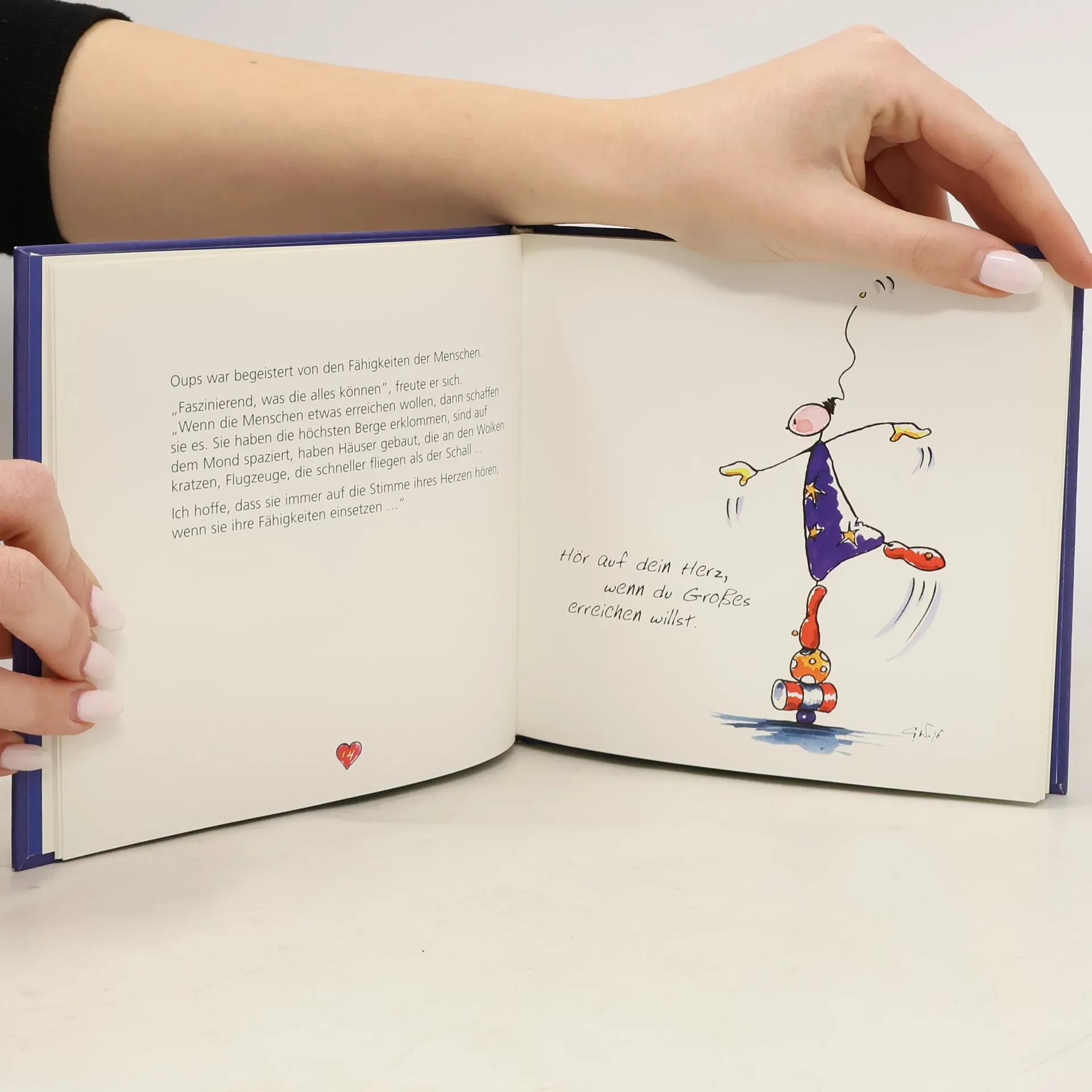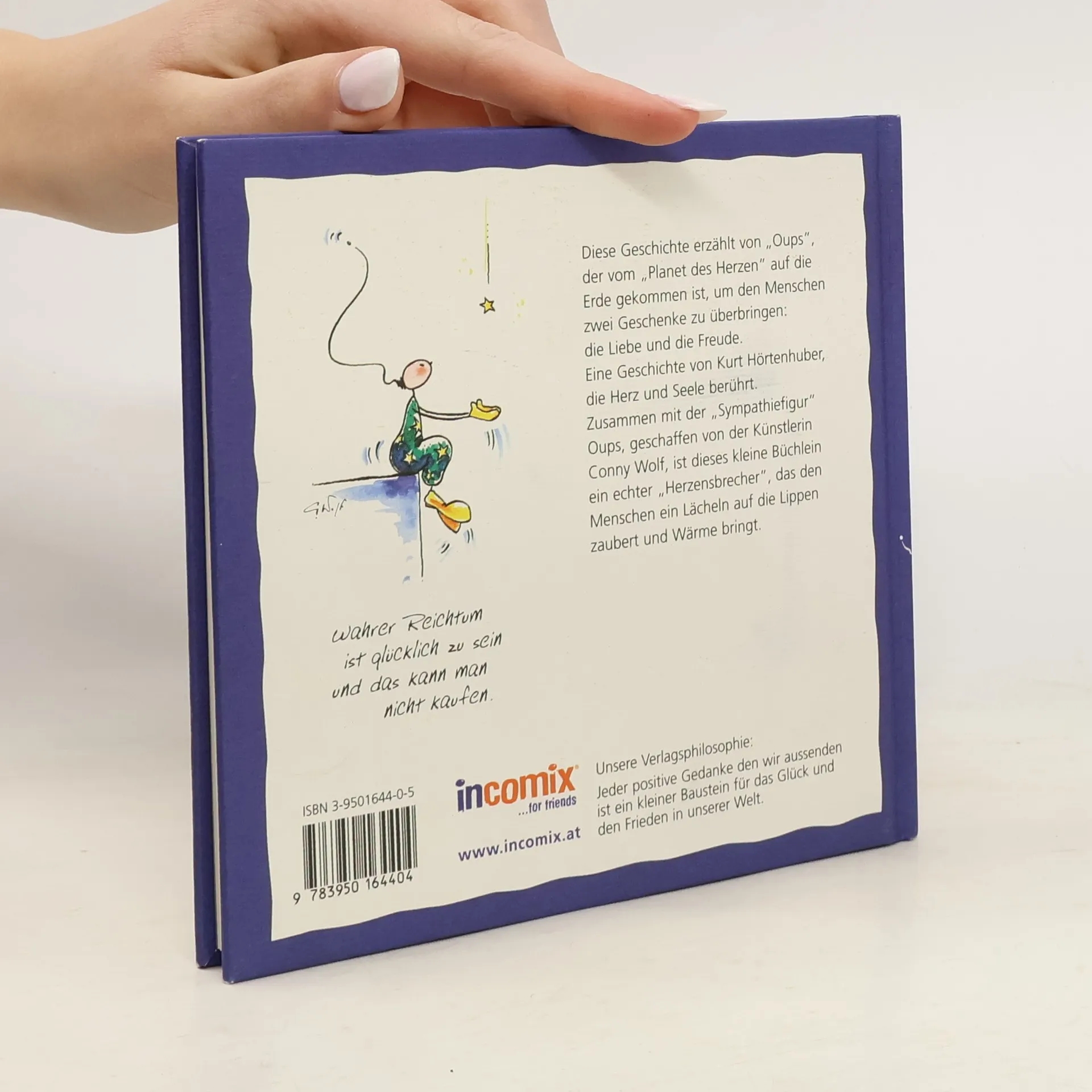Diese Geschichte erzählt von „Oups”, der vom „Planet des Herzen” auf die Erde gekommen ist, um den Menschen zwei Geschenke zu überbringen: die Liebe und die Freude. Eine Geschichte von Kurt Hörtenhuber, die Herz und Seele berührt. Zusammen mit der „Sympathiefigur” Oups, geschaffen von der Künstlerin Conny Wolf, ist dieses kleine Büchlein ein echter „Herzensbrecher”, das den Menschen ein Lächeln auf die Lippen zaubert und Wärme bringt.
