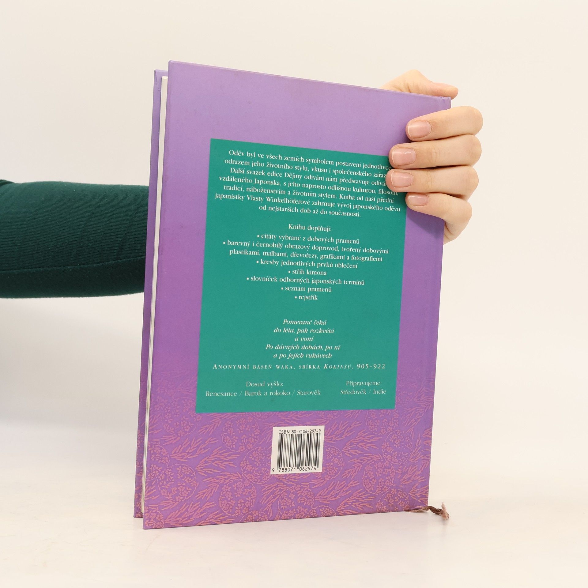 Čtvrtý svazek souboru o dějinách odívání je věnován japonské oděvní kultuře od doby prehistorické až po současnost. Kniha známé české japanistky sleduje vývoj japonského odívání jako součást japonské kultury, životního stylu a filozofie. Zabývá se také významem oděvu pro vyjádření společenského postavení. V souvislosti s tím autorka probírá i japonské šperkařství, kosmetiku, účesy a způsob oblékání tradičních japonských oděvů. Doplněno množstvím kvalitních barevných fotografií i reprodukcemi obrazů a grafik, které se týkají tématu. Na závěr je připojen slovníček japonských termínů z oblasti odívání a textilu.
