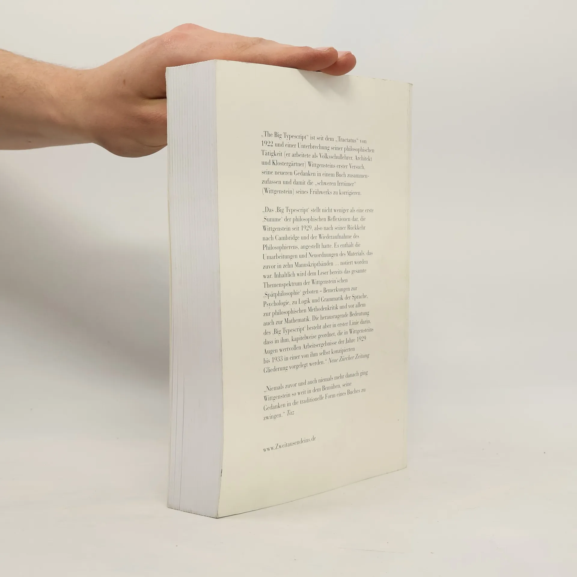 Wittgenstein revidiert Wittgenstein: The Big Typescript. Sein „Tractatus logico-philosophicus“ schien die philosophischen Probleme „im Wesentlichen endgültig gelöst“ (Wittgenstein) zu haben. Doch dann machte Wittgenstein Notizen für ein „zweites Buch“, das die, so Wittgenstein, „schweren Irrtümer“ seines Frühwerkes korrigieren sollte. Vieles davon vernichtete er, doch in seinem Nachlass fanden sich noch immer ca. 20.000 beschriebene Blätter. „‚The Big Typescript‘ ist deswegen bedeutsam, weil in ihm die enge Verbindung von mathematisch-logischer und sprachphilosophischer Reflexion in Wittgensteins Denken geradezu exemplarisch vorgeführt wird“ (Börsenblatt). Der komplette Text der Originalausgabe (deutscher Text) zu 155,94 EUR als Sonderedition im Format 16,5x24 cm. Nur bei uns.