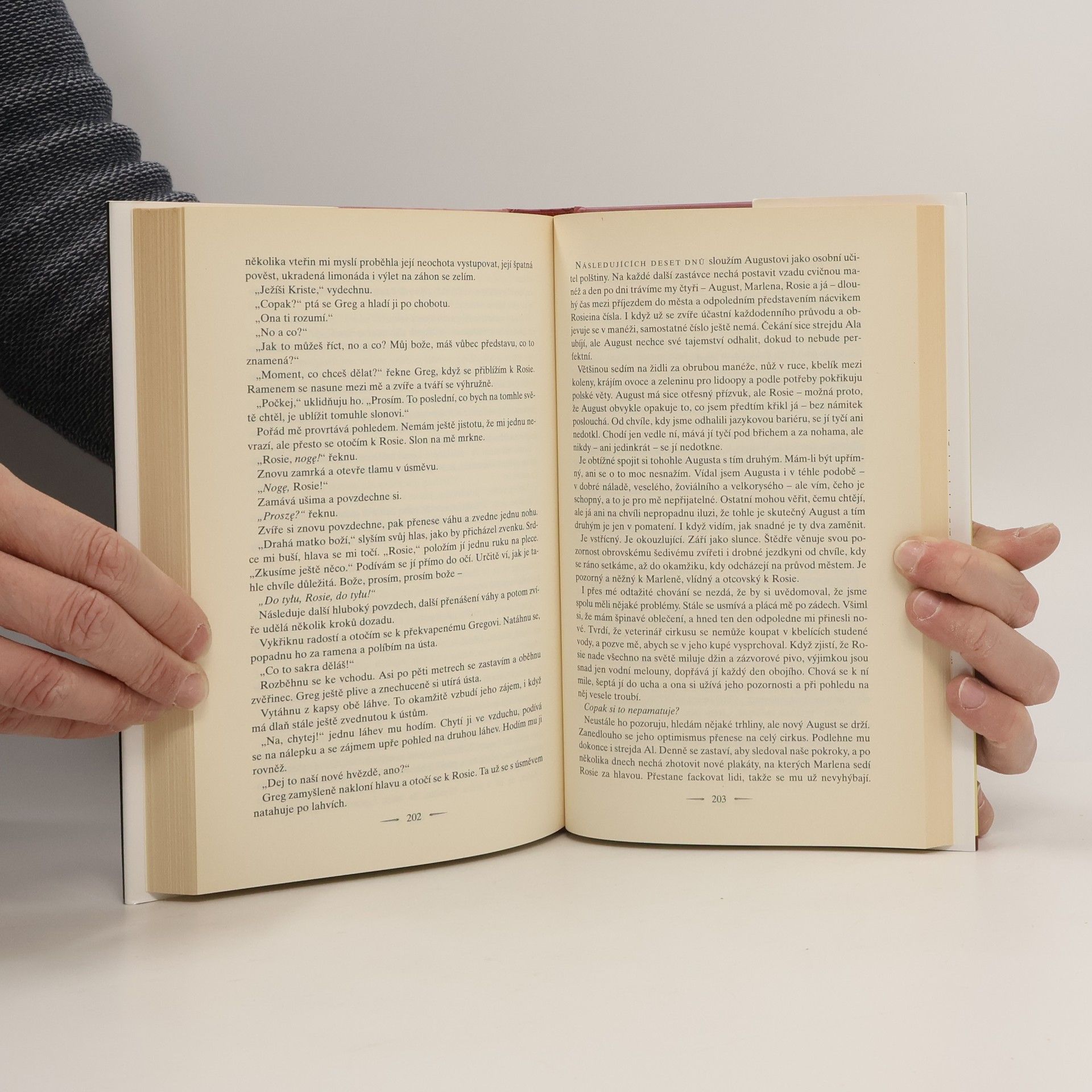 Jacob Jankowski sice o svých vzpomínkách nemluvil, ale v jeho devadesátileté paměti zůstávaly. Přechovával v ní vzpomínky na dobu, kdy ho osud hodil do vlaku, v němž měl domov cirkus Benzini – nejúžasnější podívaná na světě. Vzpomínky na svět zalidněný podivíny a klauny, který byl plný zázraků, bolesti, zloby a vášně. Na svět s vlastními úzce vymezenými iracionálními pravidly, s vlastním pojetím života i smrti. Svět cirkusu byl pro Jacoba zároveň spásou i peklem. Přišel do něho, protože ho opustilo štěstí – zůstal bez rodiny a bez peněz a netušil, jak dál, dokud nepřistál na své lokomotivou tažené „lodi komediantů“. Právě začínala krize a každý v tomhle třetiřadém cirkuse byl rád, že má alespoň nějakou práci. Marlenu, hvězdu volné drezúry koní, sem přivedla láska k nesprávnému muži, řediteli zvěřince s násilnickými sklony. Slonice Rosie se k cirkusu dostala jako obrovská šedivá naděje, nové číslo, které mělo cirkus zachránit. Jenže s Rosie nebylo možné žádné číslo nacvičit, nebyla schopná poslechnout ani jednoduché příkazy. Pouto, které mezi touto nesourodou trojicí vzniklo, bylo založené na lásce a důvěře a nakonec bylo pro všechny tři jejich jedinou nadějí na přežití.