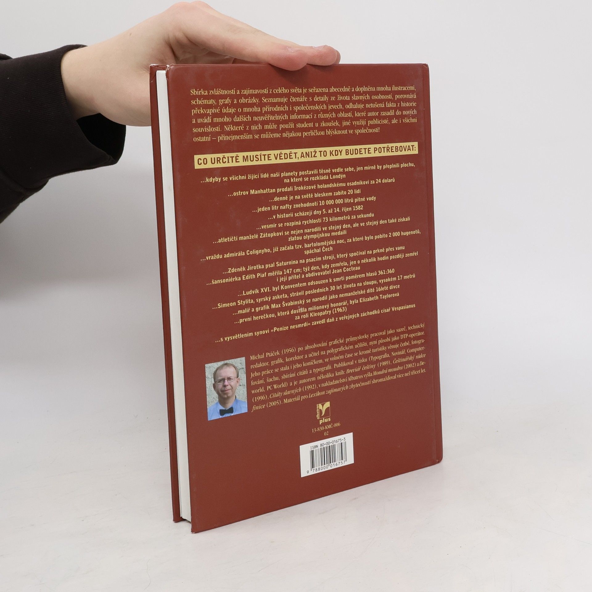 aneb co určitě musíte vědět, aniž to kdy budete potřebovat. Sbírka zvláštností a perliček z celého světa je seřazena abecedně a doplněna mnoha ilustracemi, schématy, grafy a obrázky. Seznamuje čtenáře s detaily ze života slavných osobností, porovnává překvapivé údaje o mnoha přírodních i společenských jevech, odhaluje netušená fakta z historie a uvádí mnoho dalších neuvěřitelných informací z různých oblastí, které autor zasadil do nových souvislostí. Najdete zde informace i o zálibách, názorech, rodinném životě známých osobností, čím byli jejich rodiče nebo děti.... celý text