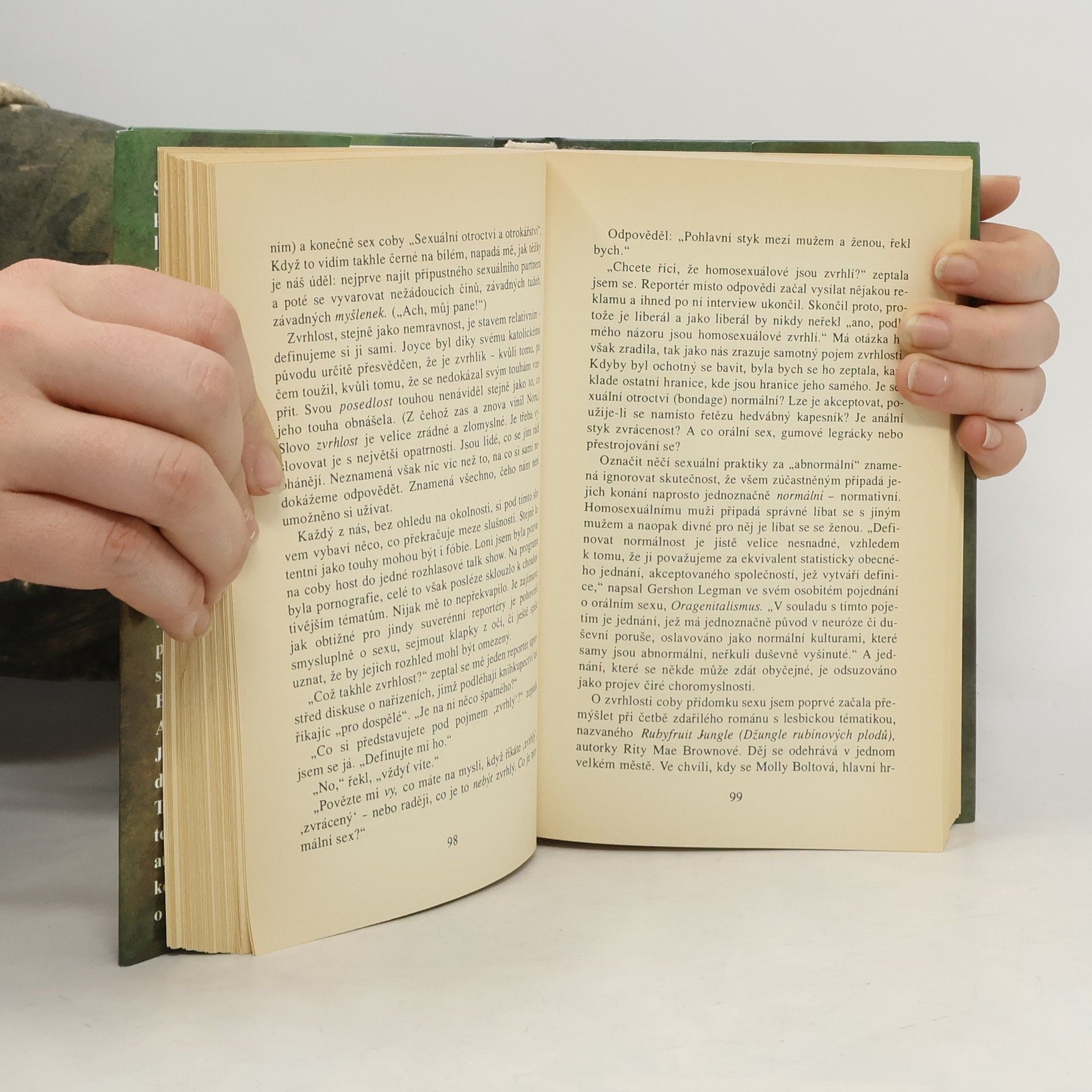 Sally Tisdaleová příjemně prostořeká, leč erudovaná americká autorka, se ve své knize s lehce provokačním názvem pouští na tenký led intimní filosofie sexu, jak avizuje už podtitul. Zamýšlí se nad problémy prostitutek, transsexuálů a "štamgastů" v sex shopech, ale hlavně, co pro nás všechny bez rozdílu sex znamená a jak bizarní podoby na sebe může brát.