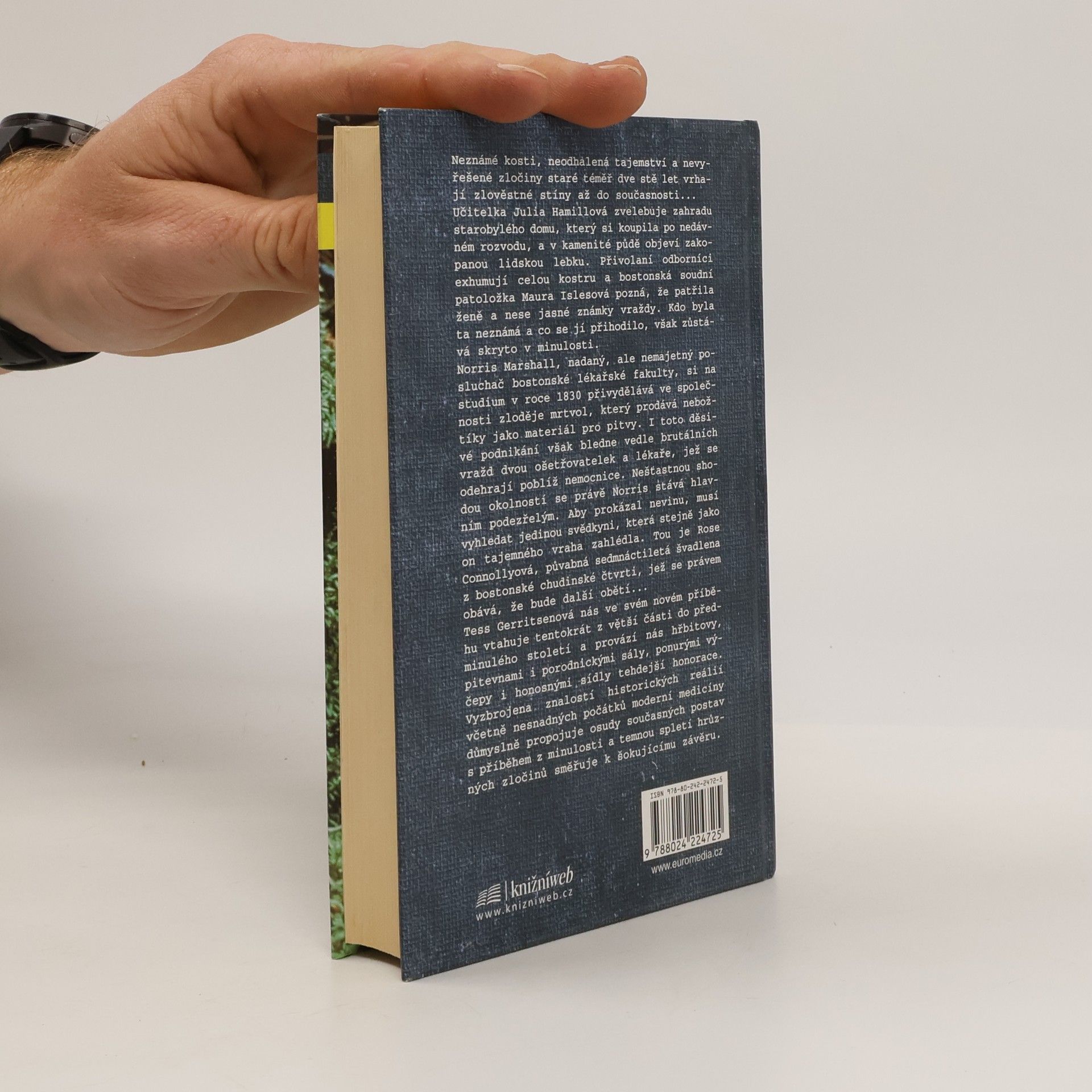 Neznámé kosti a nevyřešené zločiny staré téměř dvě stě let vrhají zlověstné stíny do současnosti. Učitelka Julia Hamillová, po nedávném rozvodu, zvelebuje zahradu starobylého domu a v kamenité půdě objeví zakopanou lidskou lebku. Po exhumaci celé kostry bostonská soudní patoložka Maura Islesová zjistí, že patřila ženě, která byla zavražděna. Kdo byla, však zůstává tajemstvím minulosti. Norris Marshall, nadaný student bostonské lékařské fakulty, si v roce 1830 přivydělává prací pro zloděje mrtvol, který prodává těla na pitvy. Tato děsivá činnost však ustupuje brutálním vraždám dvou ošetřovatelek a lékaře poblíž nemocnice, přičemž Norris se stává hlavním podezřelým. Aby prokázal svou nevinu, musí najít jedinou svědkyni, Rose Connollyovou, sedmnáctiletou švadlenu, která se obává, že se stane další obětí. Autorka nás vtahuje do předminulého století, provází nás hřbitovy, pitevnami a porodnickými sály, a vynikající znalostí historických reálií propojuje osudy současných postav s příběhem z minulosti. Temná spletitost hrůzných zločinů směřuje k šokujícímu závěru.