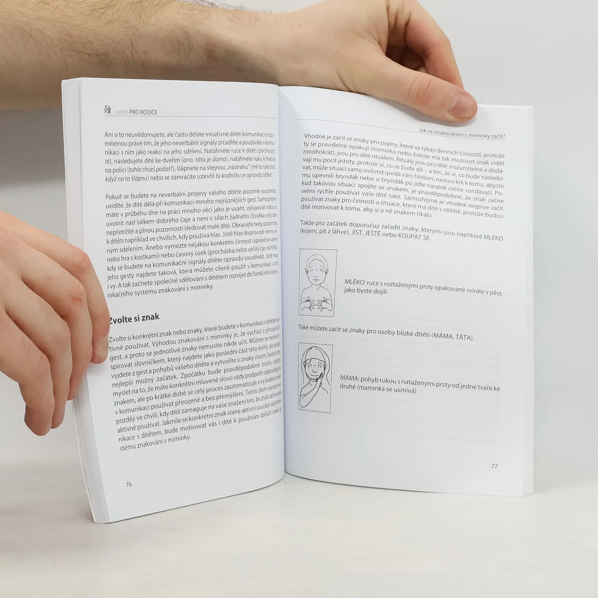 Podtitul: Komunikujeme přirozenými znaky a gesty Také někdy nevíte, proč se váš maličký vzteká, co vlastně chce či co ho rozplakalo? Účinnou cestou, jak mu porozumět, může být právě systém znakování s miminky. Nabídněte vašemu dítěti, které ještě neumí vůbec nebo dobře mluvit, možnost, jak se s vámi dorozumět. Kniha přináší srozumitelný návod k tomu, jak rozvíjet přirozenou komunikaci malých dětí gesty a znaky.Autorka klade velký důraz nejen na odborné informace, ale zejména na praktické zkušenosti využití ověřeného komunikačního systému gesty a znaky v každodenním životě s dítětem raného věku. Součástí publikace je i slovník základních znaků.... celý text