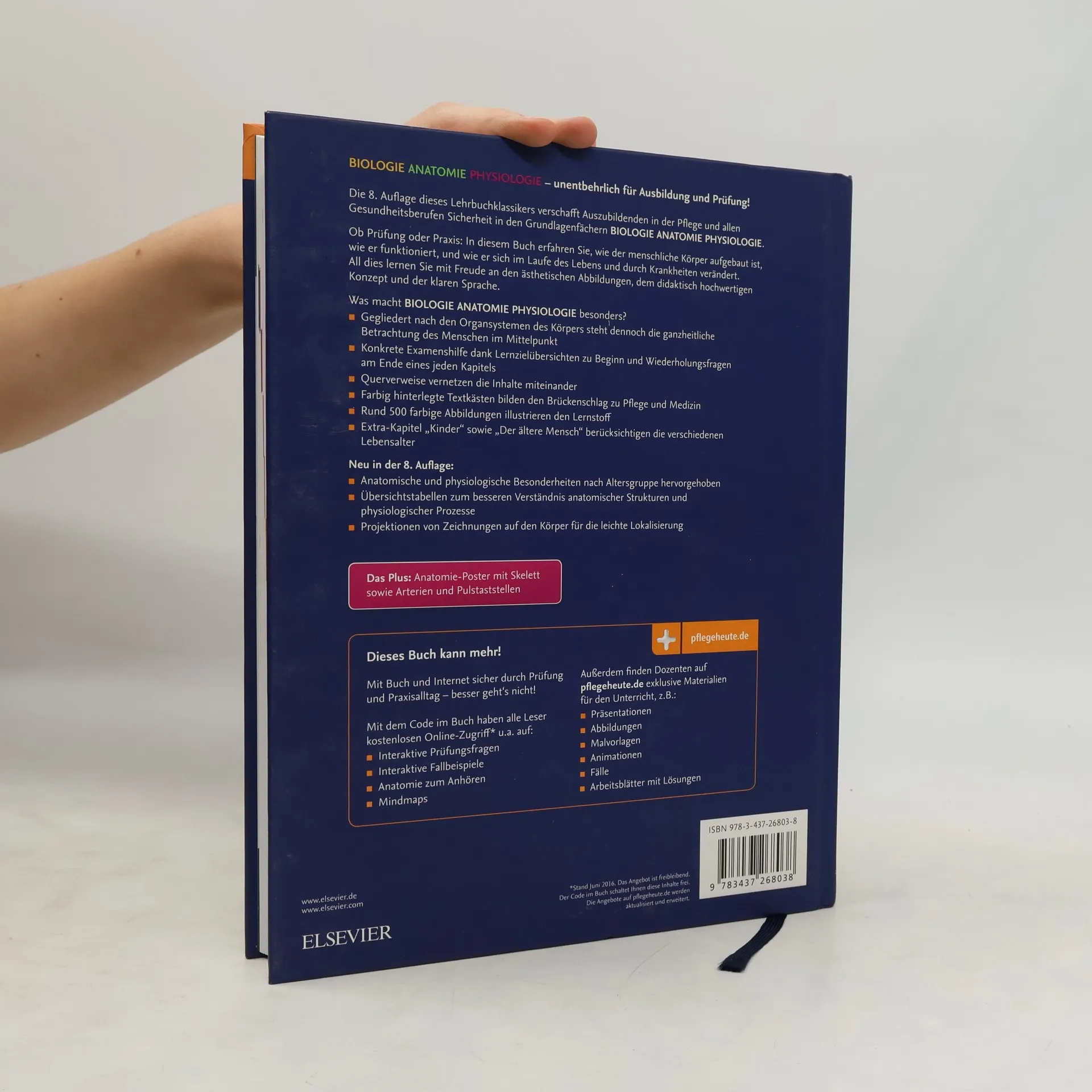 Kompakt und praxisnah bietet dieser Lehrbuch-Klassiker für die Pflegeausbildung alle Prüfungsinhalte der Grundlagenfächer Anatomie, Physiologie und Biologie. Diese sind eng vernetzt und klar auf die pflegerische Berufspraxis ausgerichtet. Mit rund 500 hervorragenden Farbillustrationen und 300 Wiederholungsfragen. In der neuen, 8. Auflage ist die geplante Generalistik in der Pflegeausbildung berücksichtigt. Entsprechend sind biologische, anatomische und physiologische Besonderheiten je nach Altersgruppe besonders hervorgehoben. Inklusive Plakat mit anatomisch beschriftetem Skelett (Vorderseite) sowie Arterien und Pulstaststellen (Rückseite)! Neu in der 8. Auflage: Projektionen von gezeichneten anatomischen Strukturen auf den menschlichen Körper lassen die Lokalisation deutlich werden. Zeichnungen stehen realen Körperteilen (Präparate/histologische Schnitte/CT-Aufnahmen) gegenüber und machen anatomische Strukturen greifbar. Unterschiede zwischen den Altersgruppen werden in Kästen und Übersichten betont. Onlinebereich auf pflegeheute. de für Schüler: Interaktive Wiederholungsfragen, Mindmaps, Hörfälle Exklusiver Onlinebereich auf pflegeheute. de für Lehrer: Abbildungsdownload, Malvorlagen, Unterrichtsmaterialien auf Powerpoint, Animationen, Fälle als Arbeitsblätter, Arbeitsblätter zur Anatomie mit Lösungen