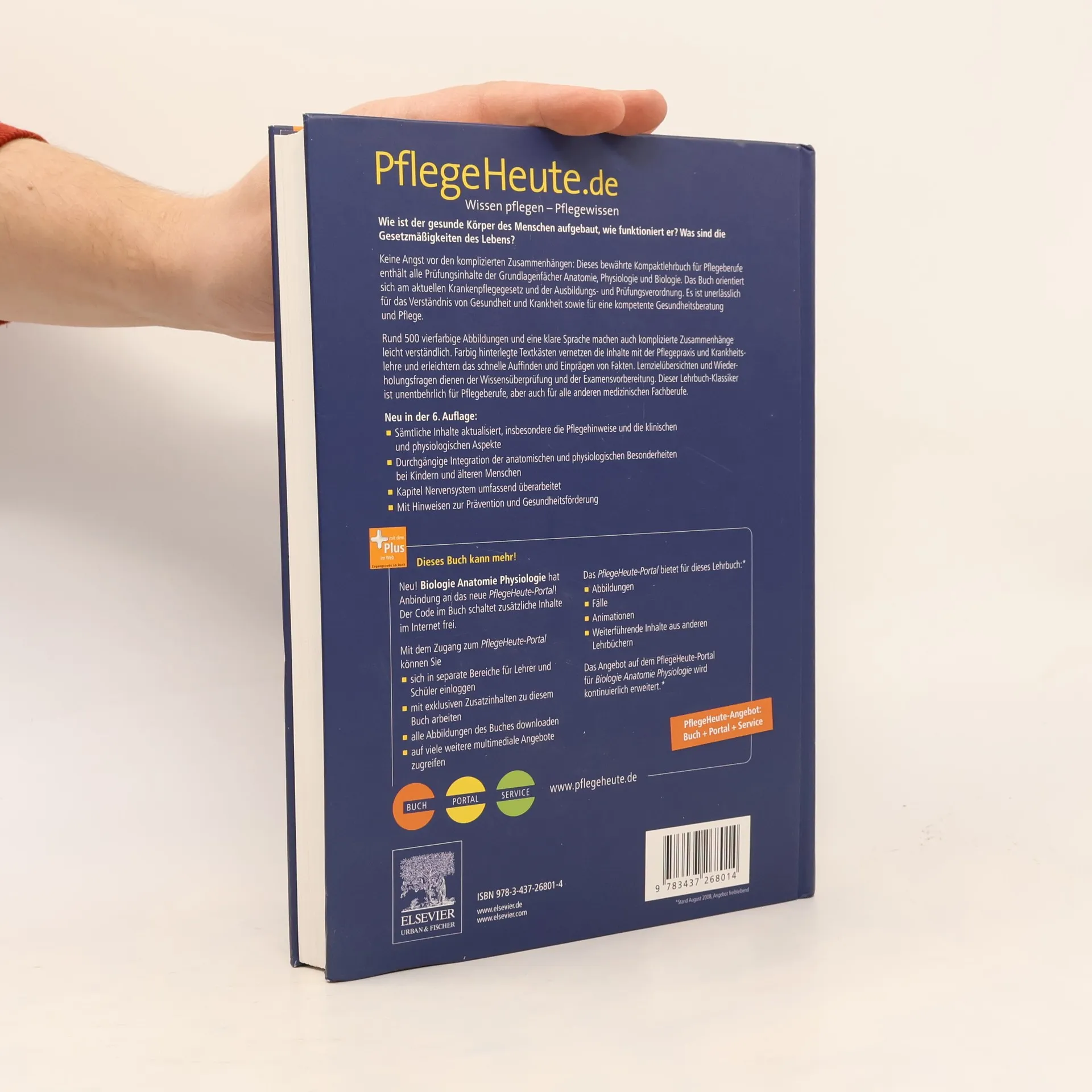 Kompakt und praxisnah bietet dieser Lehrbuch-Klassiker für die Pflegeausbildung alle Prüfungsinhalte der Grundlagenfächer Anatomie, Physiologie und Biologie. Diese sind eng vernetzt mit Krankheitslehre und Pflege und klar auf die Berufspraxis ausgerichtet. Mit rund 500 hervorragenden Farbillustrationen, Lernzielübersichten und Wiederholungsfragen. Neu in der 6. Auflage: Aufnahme Prävention und Gesundheitsvorsorge, z. B. Zusatztexte zur Vorbeugung von Herzerkrankungen Durchgängige Integration von anatomischen und physiologischen Besonderheiten bei Kindern und alten Menschen Inhalte orientierten sich am neuen Krankenpflegegesetz Dieses Buch kann mehr! Neu! Biologie Anatomie Physiologie hat Anbindung an das neue PflegeHeute-Portal! Der Code im Buch schaltet zusätzliche Inhalte im Internet frei. Mit dem Zugang zum PflegeHeute-Portal können Sie sich in separate Bereiche für Lehrer und Schüler einloggen mit exklusiven Zusatzinhalten zu diesem Buch arbeiten alle Abbildungen des Buches downloaden auf viele weitere multimediale Angebote zugreifen Das PflegeHeute-Portal bietet für dieses Lehrbuch: Abbildungen Fälle Animationen Weiterführende Inhalte aus anderen Lehrbüchern Das Angebot auf dem PflegeHeute-Portal für Biologie Anatomie wird kontinuierlich erweitert.* Stand September 2008, Angebot freibleibend.