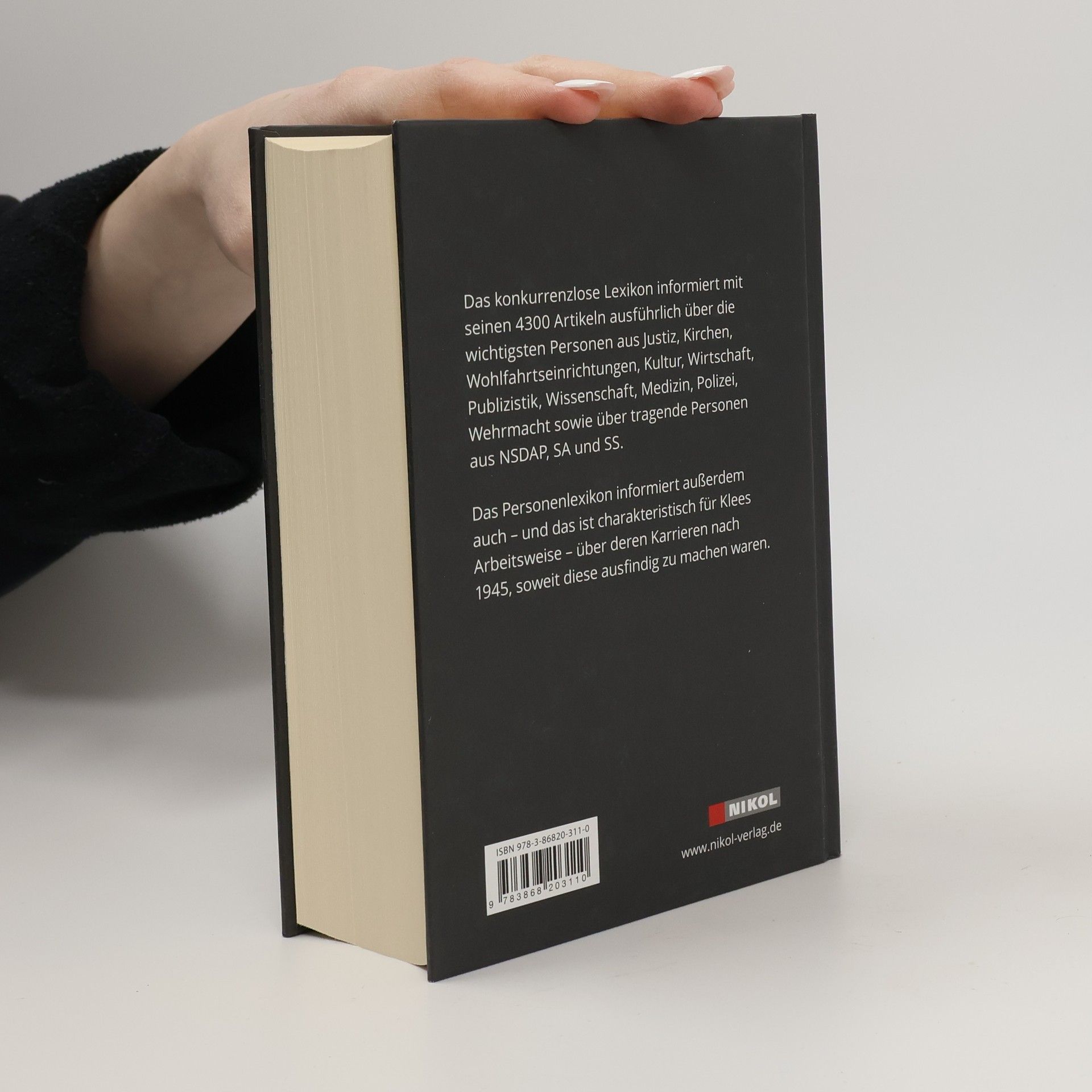 Das konkurrenzlose Lexikon informiert mit seinen 4300 Artikeln ausführlich über die wichtigsten Personen aus Justiz, Kirchen, Wohlfahrtseinrichtungen, Kultur, Wirtschaft, Publizistik, Wissenschaft, Medizin, Polizei, Wehrmacht sowie über tragende Personen aus NSDAP, SA und SS. Das Personenlexikon informiert ausserdem auch - und das ist charakteristisch für Klees Arbeitsweise - über deren Karrieren nach 1945, soweit diese ausfindig zu machen waren