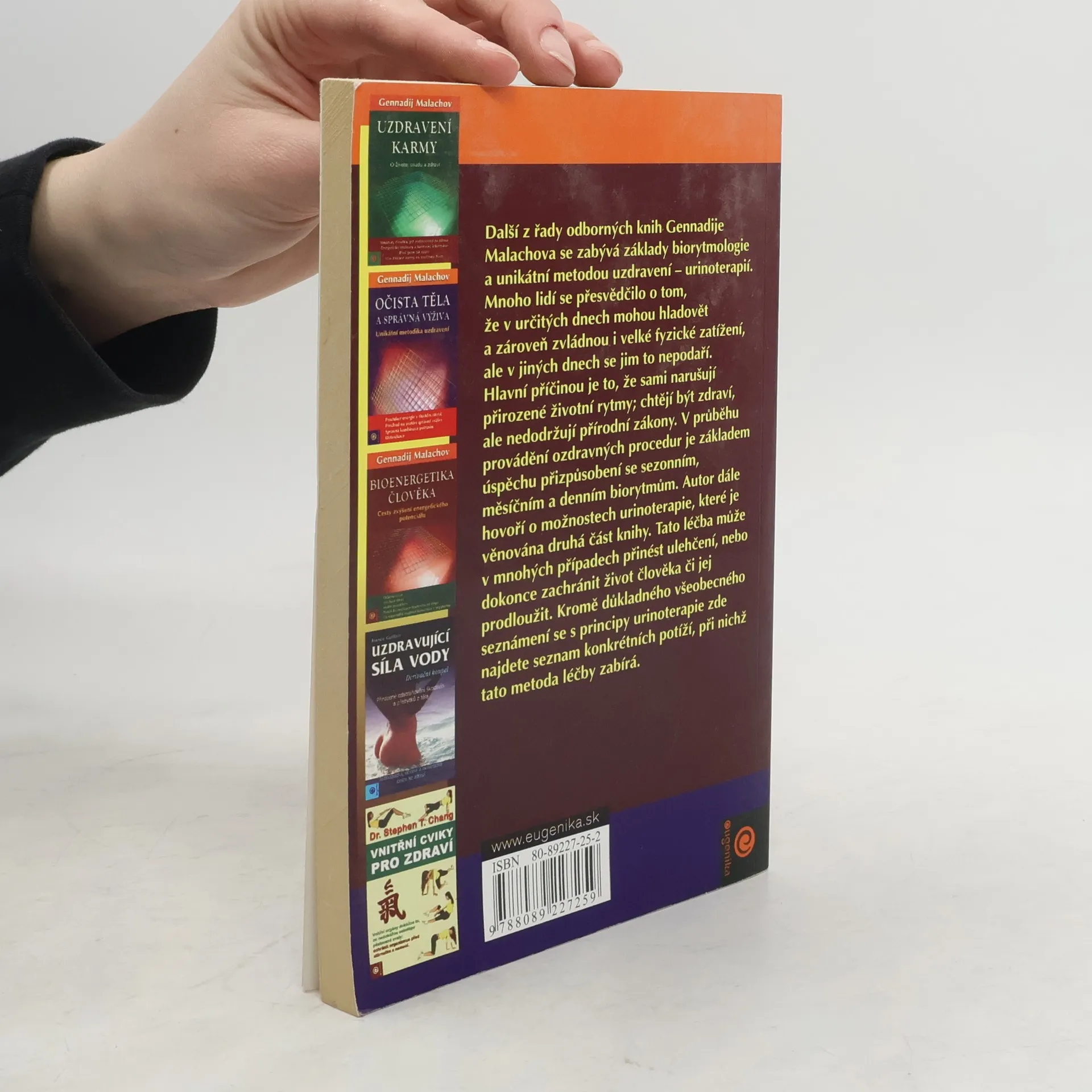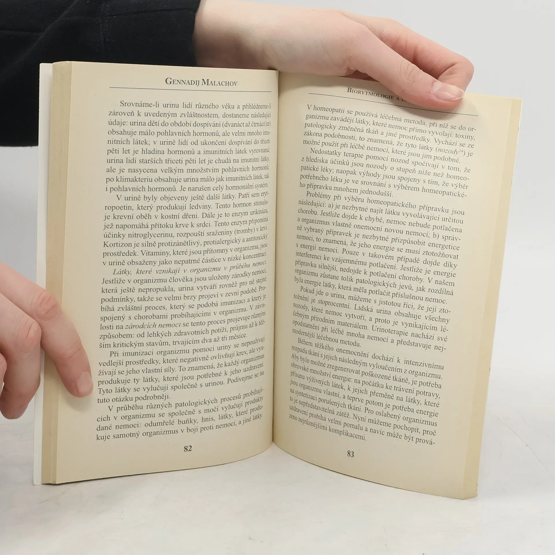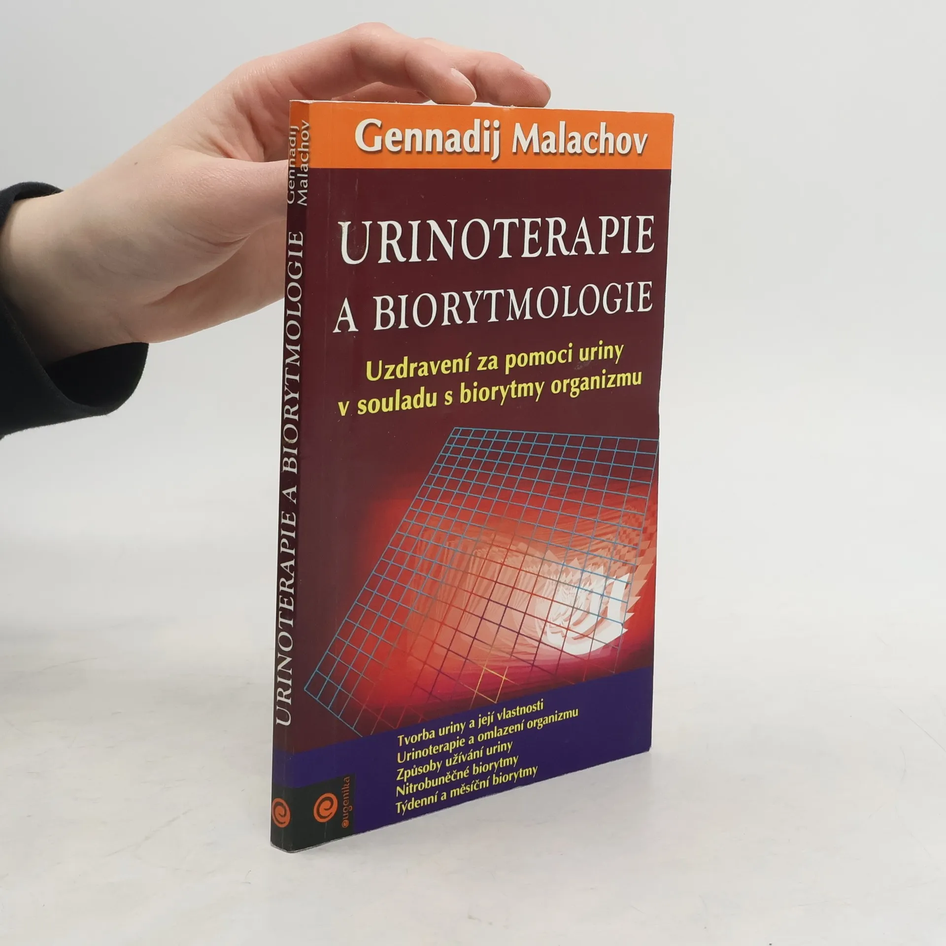 Tato kniha se zabývá základy biorytmologie a unikátní metodou uzdravení - urinoterapií. Mnoho lidí se přesvědčilo o tom, že v určitých dnech mohou hladovět a zároveň zvládnou i velké fyzické zatížení, ale v jiných dnech se jim to nepodaří. V průběhu provádění ozdravných procedur je základem úspěchu přizpůsobení se sezonním, měsíčním a denním biorytmům. Autor dále hovoří o možnostech urinoterapie, které je věnována druhá část knihy. Kromě důkladného všeobecného seznámení se s principy urinoterapie zde najdete seznam konkrétních potíží, při nichž tato metoda léčby zabýrá. Publikace: Urinoterapie a biorytmologie - Gennadij Malachov. Další z řady odborných knih Gennadije Malachova se zabývá základy biorytmologie a unikátní metodou uzdravení - urinoterapií.Kromě důkladného všeobecného seznámení se s principy urinoterapie zde najdete seznam konkrétních potíží, při nichž tato metoda metoda léčby zabíra.