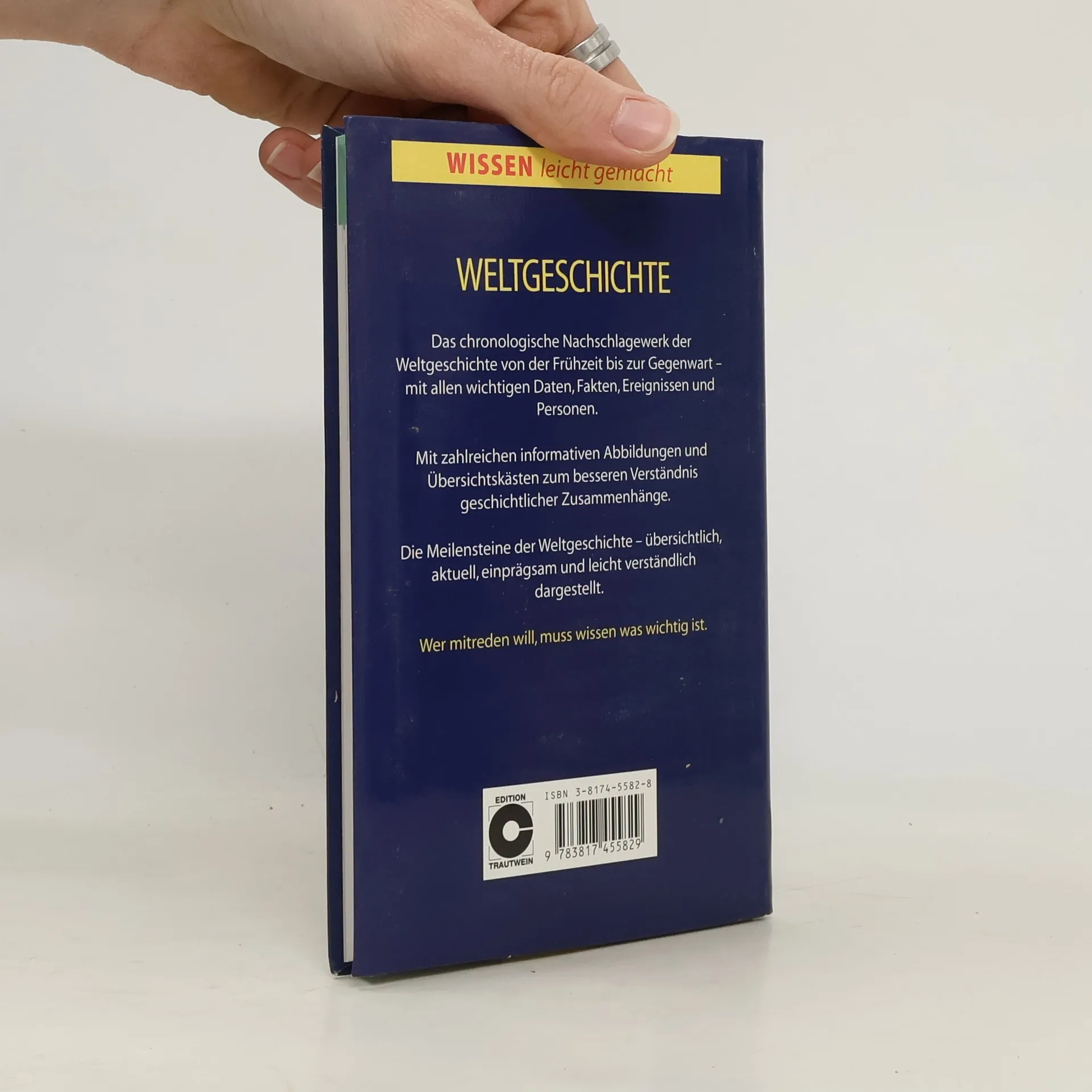 In übersichtlicher und leicht verständlicher Form bietet dieses Nachschlagewerk das wichtigste Wissen zu dem Thema Weltgeschichte. Das Buch ist gegliedert nach den sechs wichtigsten Epochen der Weltgeschichte (Frühgeschichte, ertse Hochkulturen, Antike, Mittelalter, Neuzeit, 20. Jahrhundert). Mit zahlreichen Abbildungen und ausführlichem Suchregister.