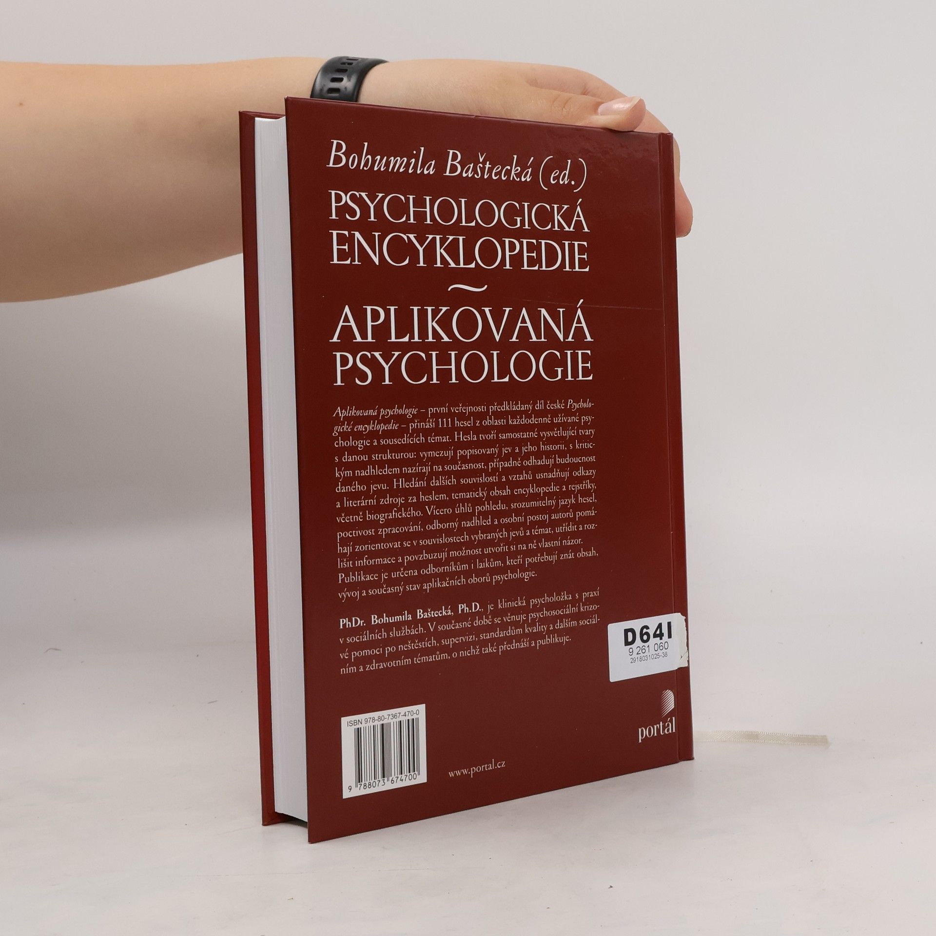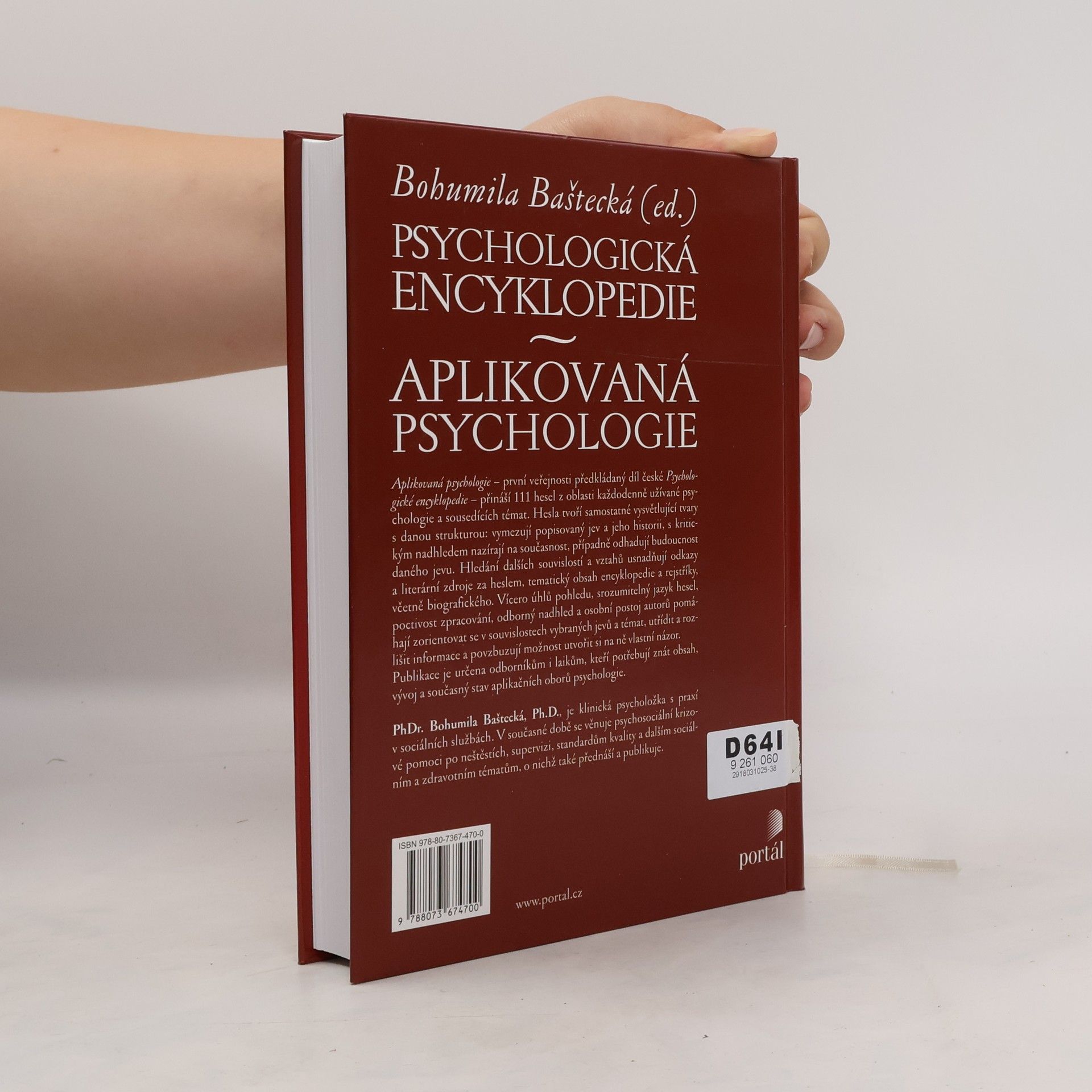 Publikace sestavená týmem našich předních odborníků představuje v ucelených statích současný stav bádání v oblasti aplikované psychologie a některých souvisejících disciplín. Obsah je strukturován do tematických bloků s jednotlivými hesly.Tato moderní encyklopedie by neměla chybět v knihovnách psychologů, psychiatrů, psychoterapeutů a dalších odborníků v pomáhajících profesích. Užitečným pomocníkem se může stát pro studenty psychologie a dalších humanitních oborů. PhDr. Bohumila Baštecká, Ph.D., je klinická psycholožka s praxí v sociálních službách. V současné době působí a vzdělává v oblasti psychosociální krizové pomoci po neštěstích, supervize, standardů kvality a dalších sociálních a zdravotních témat.