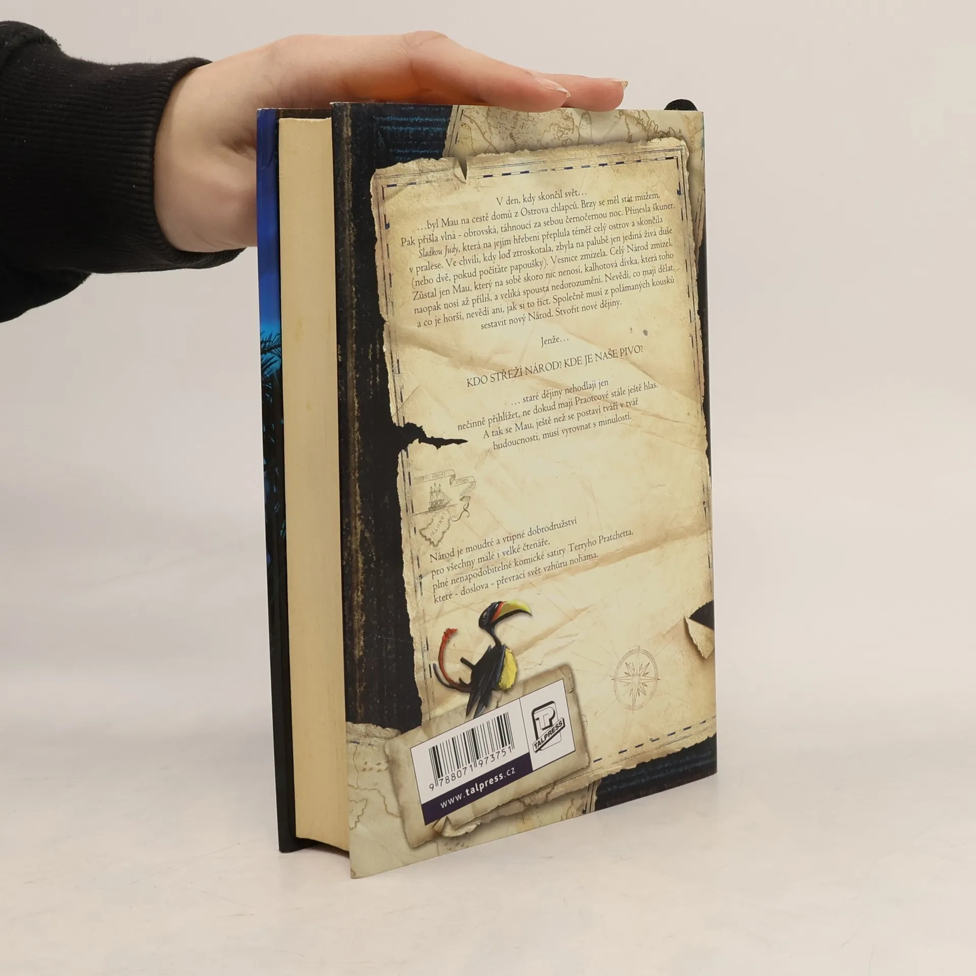 V den, kdy skončil svět… …byl Mau na cestě domů z Ostrova chlapců. Brzy se měl stát mužem. Pak přišla vlna – obrovská, táhnoucí za sebou černočernou noc. Přinesla škuner, Sladkou Judy, která na jejím hřebeni přeplula téměř celý ostrov a skončila v pralese. Ve chvíli, kdy loď ztroskotala, zbyla na palubě jen jediná živá duše (nebo dvě, pokud počítáte papoušky). Vesnice zmizela. Celý Národ zmizel. Zůstal jen Mau, který na sobě skoro nic nenosí, kalhotová dívka, která toho naopak nosí až příliš, a veliká spousta nedorozumění. Nevědí, co mají dělat, a co je horší, nevědí ani, jak si to říct. Společně musí z polámaných kousků sestavit nový Národ. Stvořit nové dějiny. Jenže… Kdo střeží Národ? Kde je naše pivo? …staré dějiny nehodlají jen nečinně přihlížet, ne dokud mají Praotcové stále ještě hlas. A tak se Mau, ještě než se postaví tváří v tvář budoucnosti, musí vyrovnat s minulostí. Národ je moudré a vtipné dobrodružství pro všechny malé i velké čtenáře, plné nenapodobitelné komické satiry Terryho Pratchetta, které – doslova – převrací svět vzhůru nohama. Kniha vychází v opět skvělém překladu Jana Kantůrka.