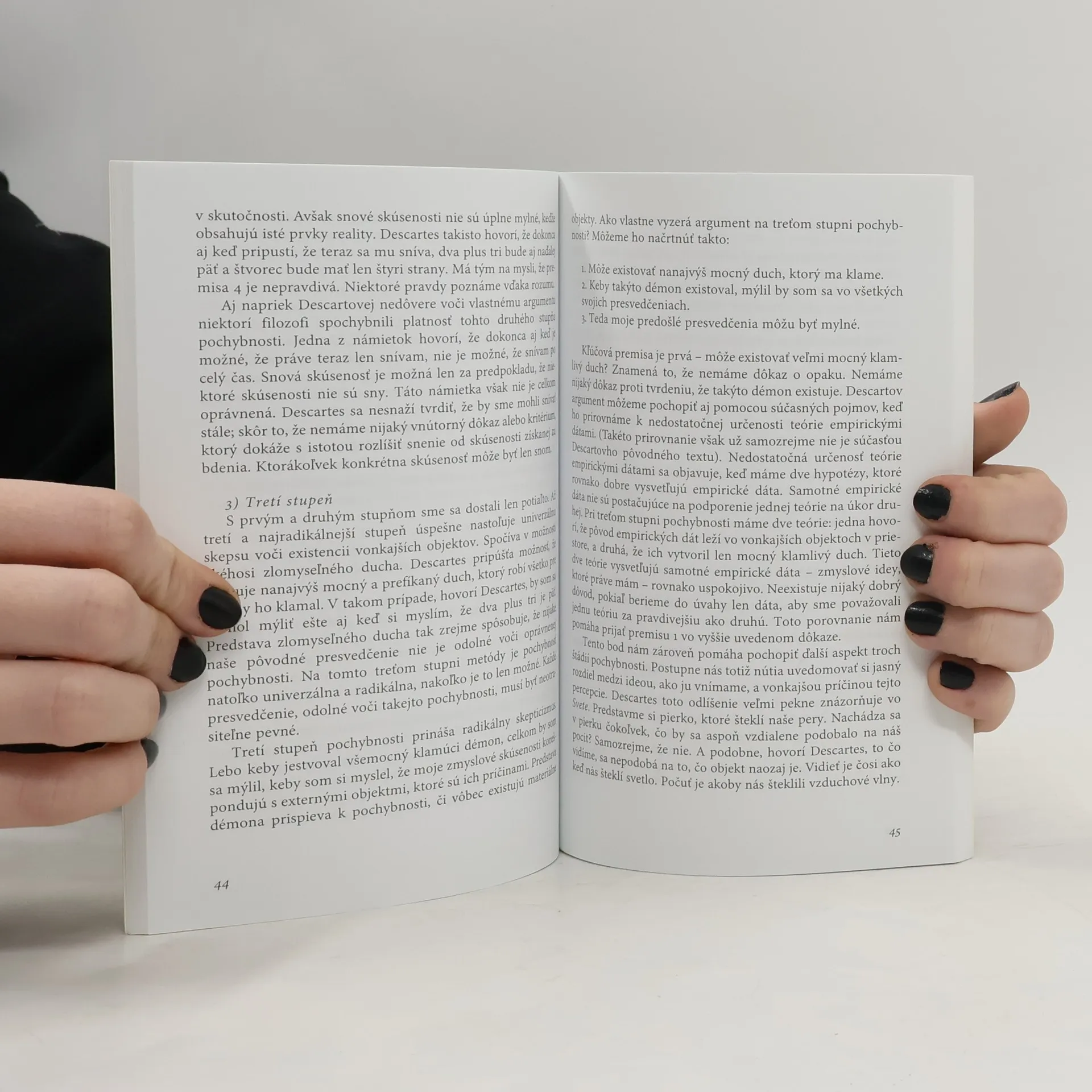 Táto kniha prináša stručný, precízny a zrozumiteľný prehľad najdôležitejších Descartových myšlienok. Od skúmania jeho metafyzických východísk prechádza k analýze a kritike jednotlivých karteziánskych rozpracovaní fyziky, psychológie, či argumentov o existencii Boha. René Descartes (1596 – 1650) zmenil našu predstavu o svete. Bol to vizionársky mysliteľ a ako prvý prišiel s myšlienkou vysvetľovania všetkých fyzikálnych zmien pomocou niekoľkých základných zákonov. Použil túto významnú predstavu na neuveriteľne široké spektrum javov, od astronómie až po anatómiu. Brúsil šošovky, pozoroval hviezdy, pitval mŕtvoly, experimentoval s magnetmi a čítal, premýšľal a písal, v snahe spojiť naše poznanie do jednotného celku. Jeho filozofický odkaz nastoľuje problémy a riešenia, ktoré sú aktuálne aj dnes, napriek nekonečným námietkam alebo azda práve vďaka nim.