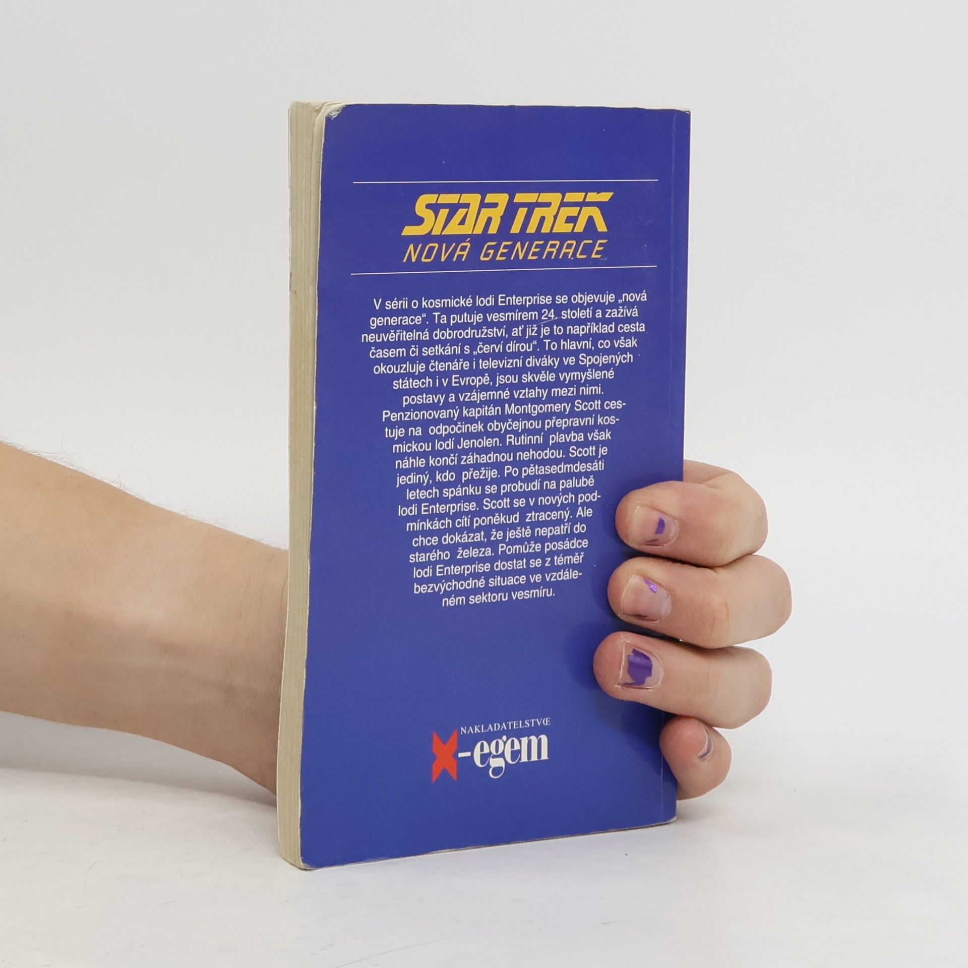 Penzionovaný kapitán Montgomery Scott cestuje na odpočinek obyčejnou přepravní kosmickou lodí Jenolen. Rutinní plavba však náhle končí záhadnou nehodou. Scott je jediní, kdo přežije. Po pětasedmdesáti letech spánku se probudí na palubě lodi Enterprise. Scott se v nových podmínkách cítí poněkud ztracený. Ale chce dokázat, že ještě nepatří do starého železa. Pomůže posádce lodi Enterprise dostat se z téměř bezvýchodné situace ve vzdáleném sektoru vesmíru. Po velkém úspěchu první televizní série Star Trek se objevilo v roce 1987 její pokračování pod označením Nová generace. Nový typ vesmírné lodi Enterprise, na jejíž palubě žije přes tisíc osob, řídí posádka „nové generace" - kapitán Jean-Luc Pikard, první důstojník William Riker, android Dat, lodní poradkyně Deanna Troi, mladý slepý poručík Geordi La Forge a další. Vzápětí po příznivé odezvě televizních diváků ve Spojených státech i v Evropě se objevily i první romány, napsané osvědčenými autory americké sci-fi literatury.... celý text