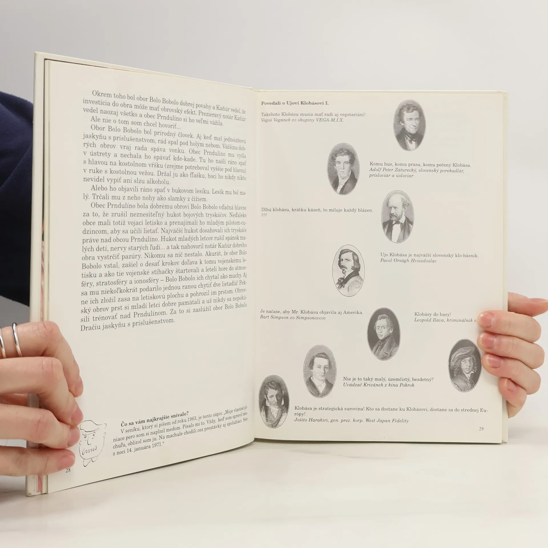 Vydavateľstvo HEVI pozýva mladých i veľkých čitateľov, divákov a poslucháčov na predstavenie jedného muža "Rozprávky uja Klobásu" začínajúce sa práve v tejto chvíli v tejto knižke. Text napísal, v hlavnej úlohe uja Klobásu a v mnohých vedľajších úlohách vystupuje, fotografie zo svojho archívu povyberal, čiernobiele ilustrácie zhotovil a seba na fotografovanie poskytol Július Satinský.