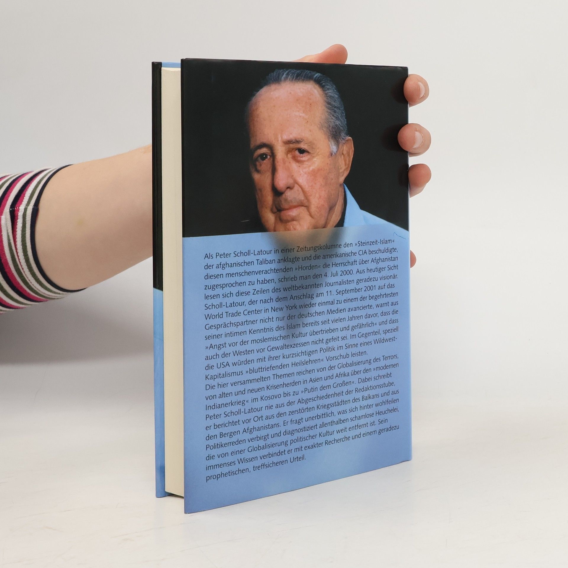 Als Peter Scholl-Latour in einer Kolumne den „Steinzeit-Islam“ der Taliban anprangerte und die CIA beschuldigte, diesen „Horden“ die Herrschaft über Afghanistan zugesprochen zu haben, war es der 4. Juli 2000. Rückblickend wirkt dieser Artikel des bekannten Journalisten visionär. Scholl-Latour, der nach den Anschlägen vom 11. September 2001 zu einem gefragten Gesprächspartner in den deutschen Medien wurde, warnt seit Jahren davor, dass die „Angst vor der moslemischen Kultur übertrieben und gefährlich“ sei und dass auch der Westen vor Gewaltexzessen nicht gefeit ist. Besonders die USA würden mit ihrer kurzsichtigen Politik „bluttriefenden Heilslehren“ Vorschub leisten. Die Themen seiner Beiträge reichen von der Globalisierung des Terrors und Krisenherden in Asien und Afrika bis zum „modernen Indianerkrieg“ im Kosovo und „Putin dem Großen“. Scholl-Latour schreibt nie aus der Abgeschiedenheit der Redaktionsstube, sondern berichtet vor Ort aus den zerstörten Kriegsstädten des Balkans und den Bergen Afghanistans. Politikerreden entlarvt er als schamlose Heuchelei, weit entfernt von einer globalisierten politischen Kultur. Sein immenses Wissen vereint er mit exakter Recherche und einem prophetischen Urteil.